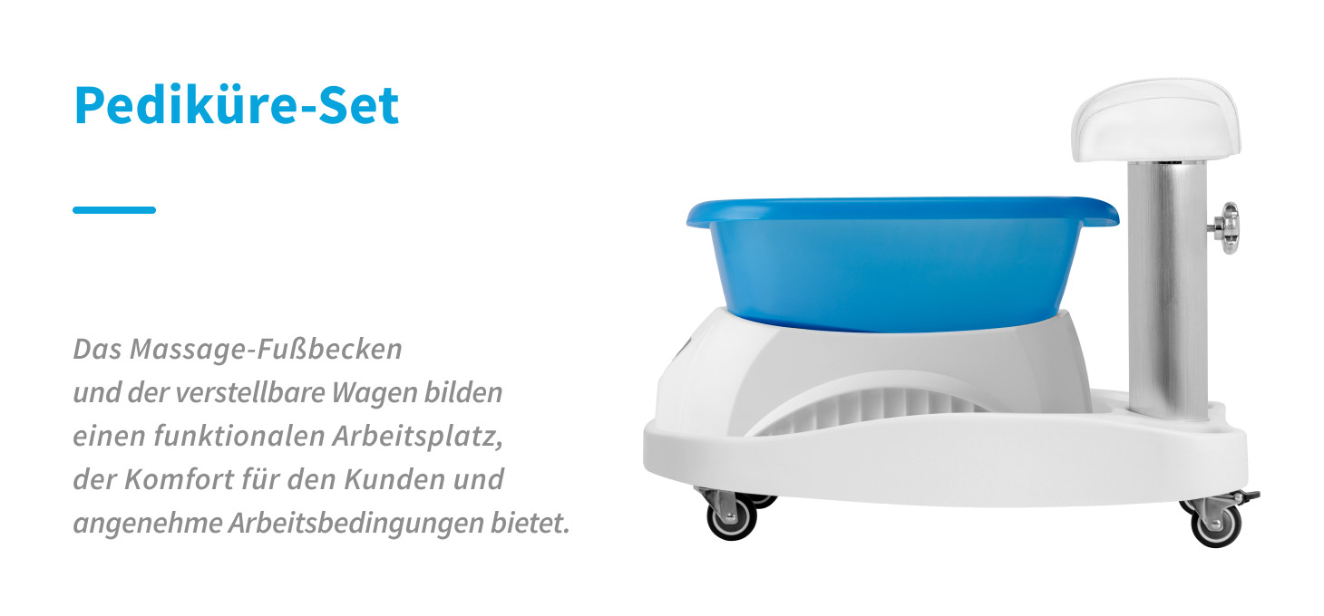 Das professionelle Azzurro Pediküre-Set umfasst eine Fußwanne mit Massagefunktion sowie einen verstellbaren Wagen und bildet eine komplette Arbeitsstation für Kosmetik- und Podologiepraxen. Die durchdachte Konstruktion erhöht den Komfort für den Kunden und sorgt gleichzeitig für Mobilität und angenehmes Arbeiten für den Behandler.