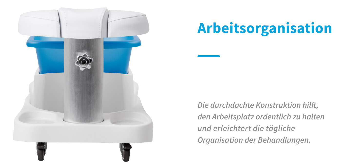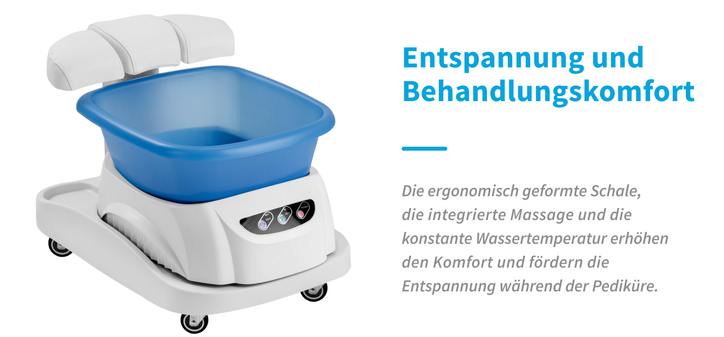 Die ergonomisch geformte Wanne ermöglicht eine bequeme Fußpositionierung, während integrierte Massagefunktionen und die konstante Wassertemperatur den Behandlungskomfort erhöhen. Die robuste Konstruktion gewährleistet Langlebigkeit bei intensiver Nutzung, und die verwendeten Materialien erleichtern die Reinigung und Hygiene.