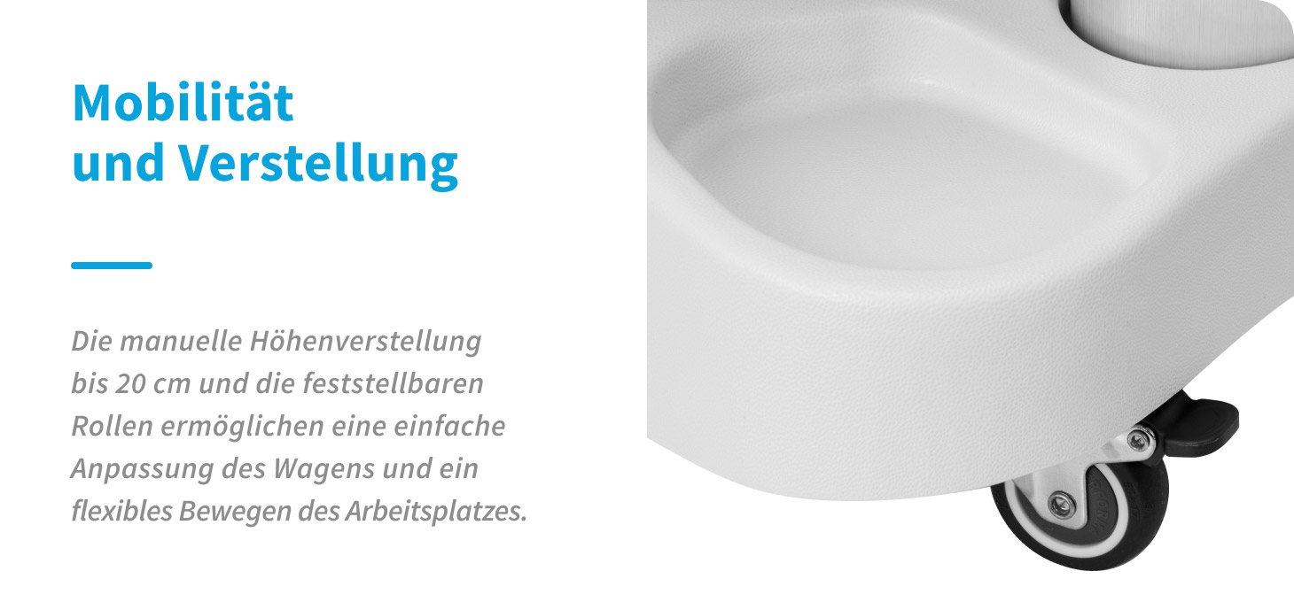 Der verstellbare Wagen mit Fußstütze ermöglicht die Anpassung der Position an die Bedürfnisse des Kunden und des Anwenders. Manuelle Höhenverstellung bis zu 20 cm, feuchtigkeitsbeständiger Bezug aus Kunstleder sowie stabile Gummiräder mit Feststellbremse sorgen für Komfort, Mobilität und eine gute Organisation des Arbeitsplatzes.