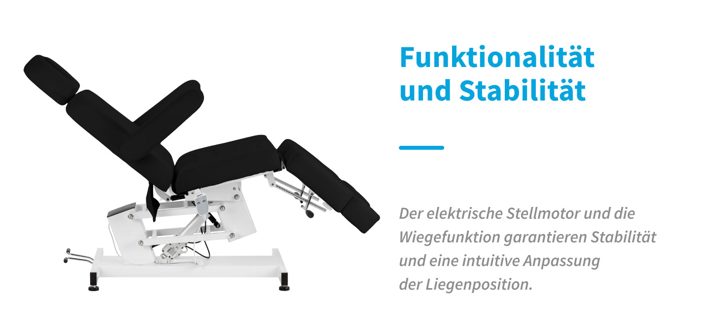 Der elektrische Kosmetikliege Azzurro 706 ist eine moderne Lösung, die speziell für Podologen entwickelt wurde. Der Einsatz eines elektrischen Antriebs sowie die manuelle Neigungsverstellung der geteilten Fußstütze und Rückenlehne und die Schaukelfunktion gewährleisten eine präzise Einstellung der einzelnen Liegekomponenten. Die Konstruktion zeichnet sich durch hohe Stabilität und vielseitige Einsatzmöglichkeiten aus, wodurch sie sich hervorragend für Kosmetik- und Podologiepraxen eignet. Die intuitive Bedienung und der große Einstellbereich ermöglichen eine komfortable Anpassung des Stuhls an die Bedürfnisse sowohl des Kunden als auch der behandelnden Person.