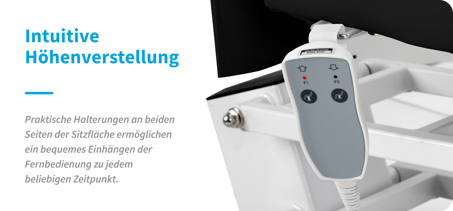 Die Steuerung über eine kabelgebundene Fernbedienung ermöglicht die Einstellung der Sitzhöhe im Bereich von 63 bis 85 cm. Der Einstellbereich erlaubt eine einfache Anpassung der Position an die Art der durchgeführten Behandlung, unter Berücksichtigung des Komforts des Kunden und der Arbeitsergonomie des Spezialisten. Für mehr Bedienkomfort kann die Fernbedienung an Halterungen auf beiden Seiten des Sitzes aufgehängt werden.