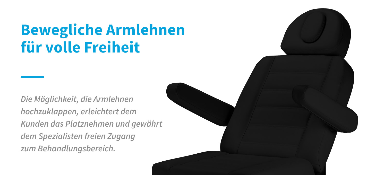 Die breite Sitzfläche sorgt für hohen Komfort auch bei längeren Behandlungen. Die beweglichen, hochklappbaren Armlehnen erleichtern dem Kunden das Platznehmen auf dem Liege und gewährleisten dem Behandler freien Zugang. Der Liege ist mit einer um 20 Zentimeter ausziehbaren Kopfstütze ausgestattet, die eine stabile Stütze für den Kopf und zusätzlichen Komfort bietet, insbesondere für größere Benutzer. Eine unter einer Abdeckung verborgene Öffnung in der Kopfstütze erhöht den Komfort in liegender Position, insbesondere bei Behandlungen am Rücken. Durchdachte Konstruktionslösungen sorgen für den Komfort des Kunden und die Ergonomie der Arbeit des Spezialisten.