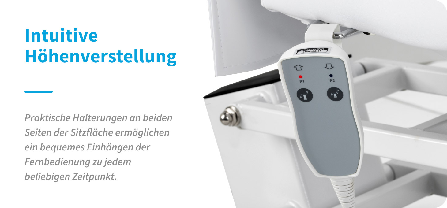 Die Steuerung über eine kabelgebundene Fernbedienung ermöglicht die Einstellung der Sitzhöhe im Bereich von 63 bis 85 cm. Der Einstellbereich erlaubt eine einfache Anpassung der Position an die Art der durchgeführten Behandlung, unter Berücksichtigung des Komforts des Kunden und der Arbeitsergonomie des Spezialisten. Für mehr Bedienkomfort kann die Fernbedienung an Halterungen auf beiden Seiten des Sitzes aufgehängt werden.