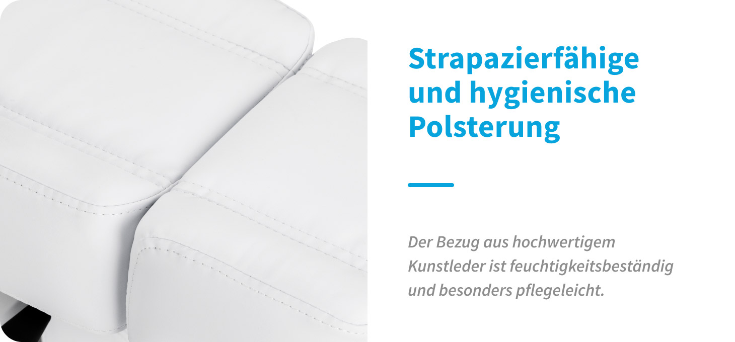 Die solide Konstruktion des Stuhls sorgt für Stabilität und Langlebigkeit, und die mit Schaumstoff in passender Härte gefüllte Sitzfläche garantiert Komfort auch bei lang andauernden Behandlungen. Der Bezug aus hochwertigem, angenehm anzufassendem Kunstleder in Weißtönen verleiht dem Ganzen ein professionelles Aussehen und ist gleichzeitig feuchtigkeitsbeständig und pflegeleicht. Das robuste Gestell und die präzisen Verarbeitungsdetails unterstreichen den modernen Charakter des Stuhls und tragen zur Ergonomie der Sitzfläche bei.