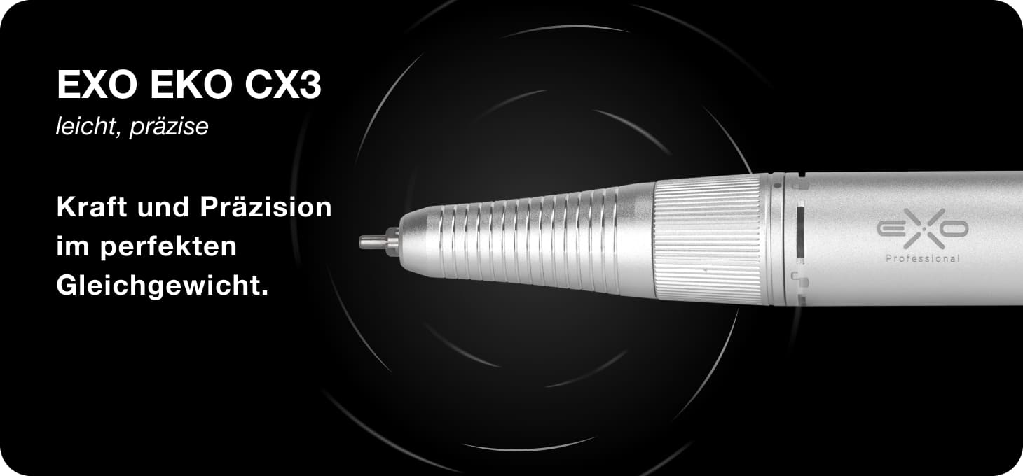 Der austauschbare Kopf, der für die EXO EKO CX3 Fräsmaschine entworfen wurde, ist eine Kombination aus solider Verarbeitung und ergonomischer Form. Das leichte, gut ausbalancierte Design sorgt für einen stabilen Griff und hohe Präzision beim Entwickeln von Nägeln und Nagelhaut. Leise Betrieb und gleichmäßige Geschwindigkeitsregelung ermöglichen eine vollständige Kontrolle über die Behandlung.