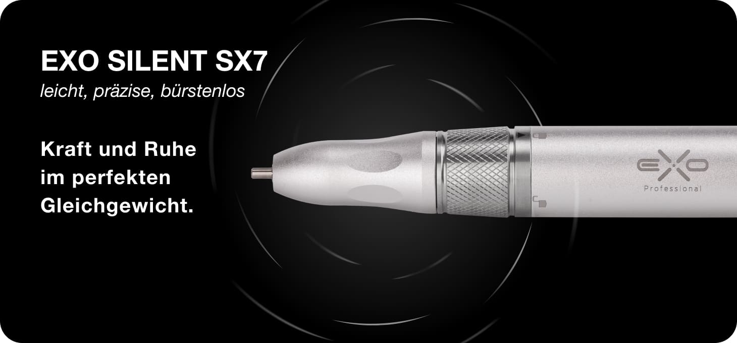 Der EXO SILENT SX7 bürstenlose Kopf kombiniert hohe Leistung mit extrem leiser Bedienung und minimalen Vibrationen. Die verwendete bürstenlose Technologie verlängert die Lebensdauer des Geräts und garantiert einen reibungslosen Betrieb auch bei längerer Belastung.