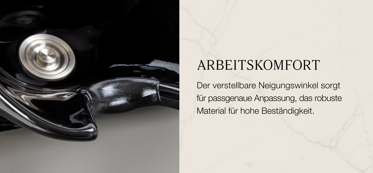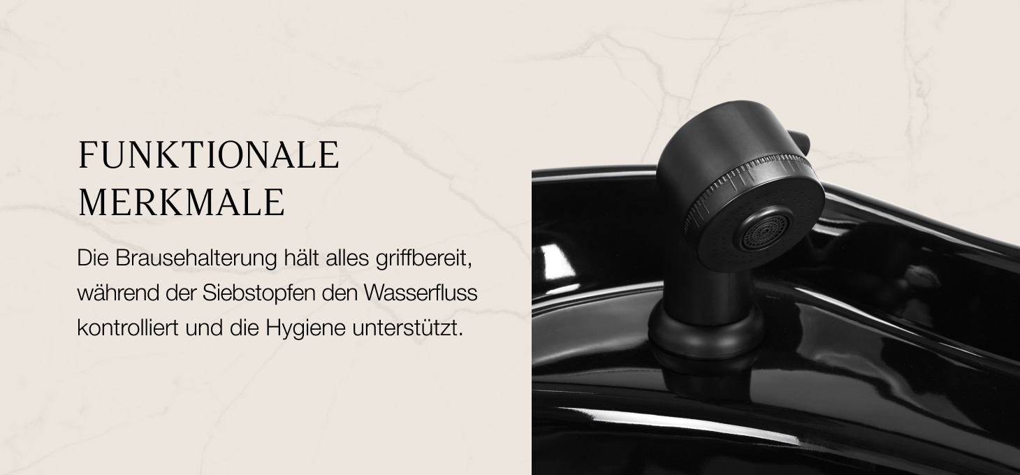 Die tiefe Keramikschale in Schwarztönen verhindert das Verspritzen von Wasser und Pflegeprodukten während der Behandlung und sorgt so für Arbeitskomfort und Ordnung am Arbeitsplatz. Der einstellbare Neigungswinkel der Schale ermöglicht eine präzise Anpassung ihrer Position an die Bedürfnisse des Kunden und erhöht so die Ergonomie bei der Nutzung. Die aus strapazierfähigem Material gefertigte Schale ist beständig gegen Verfärbungen, Kratzer und chemische Einflüsse, und die glatte Oberfläche erleichtert die Reinigung. Der ergonomisch geformte Kragen sorgt für eine bequeme Kopfstütze, während die Kunststoffauflage das Kältegefühl beim Kontakt mit der Keramikoberfläche verhindert.