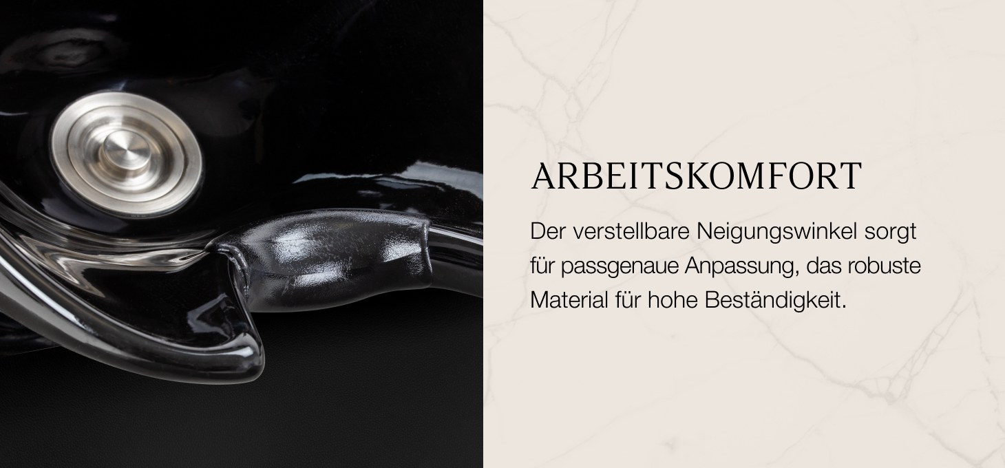 Die tiefe Keramikschale in Schwarztönen verhindert das Verspritzen von Wasser und Pflegeprodukten während der Behandlung und sorgt so für Arbeitskomfort und Ordnung am Arbeitsplatz. Der einstellbare Neigungswinkel der Schale ermöglicht eine präzise Anpassung ihrer Position an die Bedürfnisse des Kunden und erhöht so die Ergonomie bei der Nutzung. Die aus strapazierfähigem Material gefertigte Schale ist beständig gegen Verfärbungen, Kratzer und chemische Einflüsse, und die glatte Oberfläche erleichtert die Reinigung. Der ergonomisch geformte Kragen sorgt für eine bequeme Kopfstütze, während die Kunststoffauflage das Kältegefühl beim Kontakt mit der Keramikoberfläche verhindert.