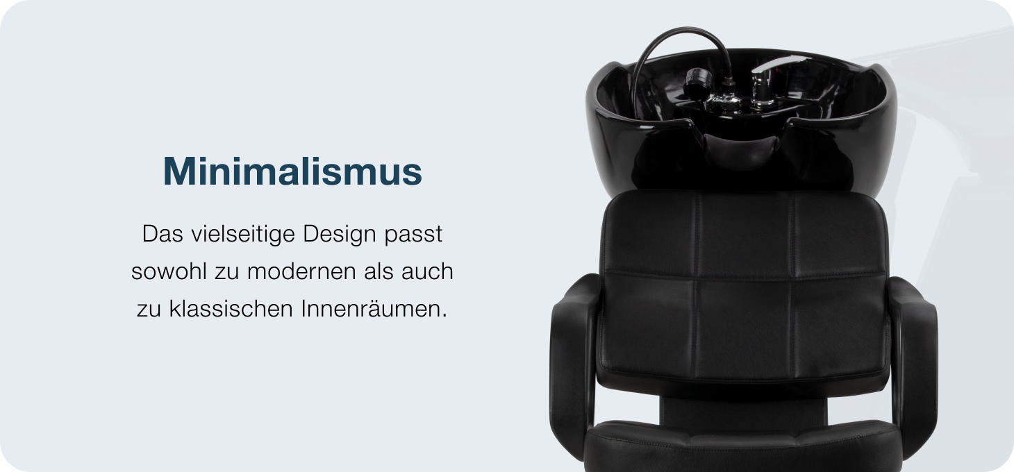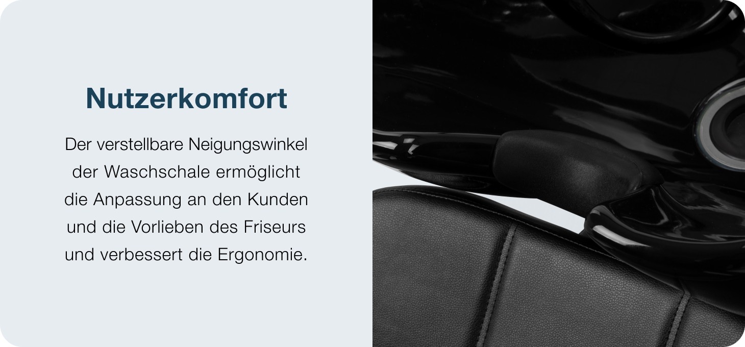 Die tiefe Keramikschale in Schwarztönen verhindert wirksam das Verspritzen von Wasser und Pflegeprodukten und trägt so zur Ordnung am Arbeitsplatz bei. Der einstellbare Neigungswinkel ermöglicht die Anpassung an die Körpergröße des Kunden und die Vorlieben des Friseurs und erhöht so die Ergonomie der durchgeführten Dienstleistungen. Die langlebige Keramik zeichnet sich durch Beständigkeit gegen Verfärbungen, Kratzer und chemische Einflüsse aus, und die glatte Oberfläche erleichtert die Aufrechterhaltung eines hohen Hygienestandards. Der geformte Kragen sorgt für eine stabile Stütze des Kopfes, während die Kunststoffauflage das Kältegefühl beim Kontakt mit der Wanne verhindert.