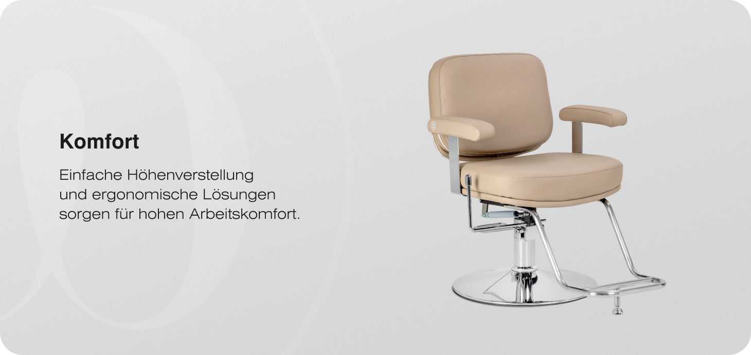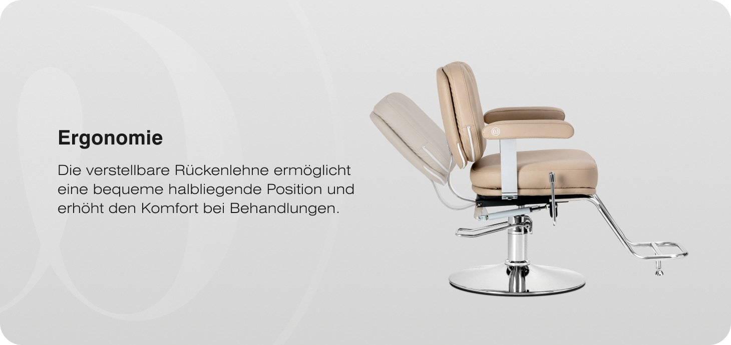 Die Konstruktion des Stuhls wurde mit Blick auf den Komfort des Kunden und die Arbeitsergonomie des Friseurs entwickelt. Die neigbare Rückenlehne ermöglicht es, den Kunden leicht in eine bequeme, halb liegende Position zu bringen, was den Komfort bei bestimmten Behandlungen erhöht. Ergonomische, gepolsterte Armlehnen bieten eine stabile und bequeme Stütze für die Arme, und die breite Sitzfläche gibt dem Kunden mehr Bewegungsfreiheit und ein Gefühl von Komfort. Der Voll drehmechanismus erleichtert die Arbeit des Stylisten erheblich , da er ein reibungsloses Manövrieren um den Stuhl herum und einen bequemen Zugang zum Kunden von jeder Seite ermöglicht.