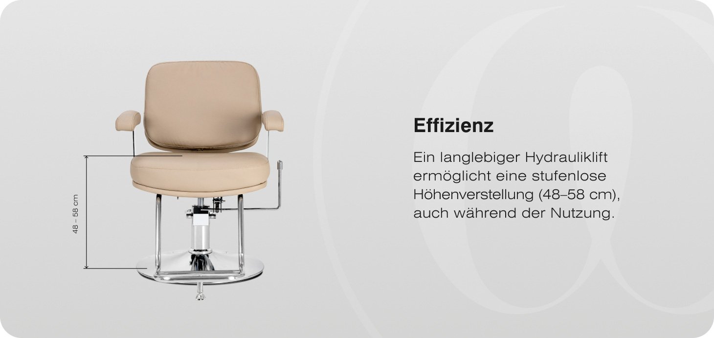 Der robuste hydraulische Hubmechanismus ermöglicht eine stufenlose Höhenverstellung des Sitzes im Bereich von 48 bis 58 cm, auch während der Benutzung des Stuhls. Dies erleichtert die ergonomische Anpassung der Position an die Körpergröße des Kunden und des Friseurs und erhöht so den Komfort und die Arbeitseffizienz. Die konturierte Rückenlehne stützt den Rücken stabil und hilft dabei, auch bei längeren Friseurbehandlungen eine bequeme Position beizubehalten. Die integrierte Fußstütze sorgt für eine bequeme und stabile Abstützung der Füße, was zu einem positiven Erlebnis während des Salonbesuchs beiträgt.