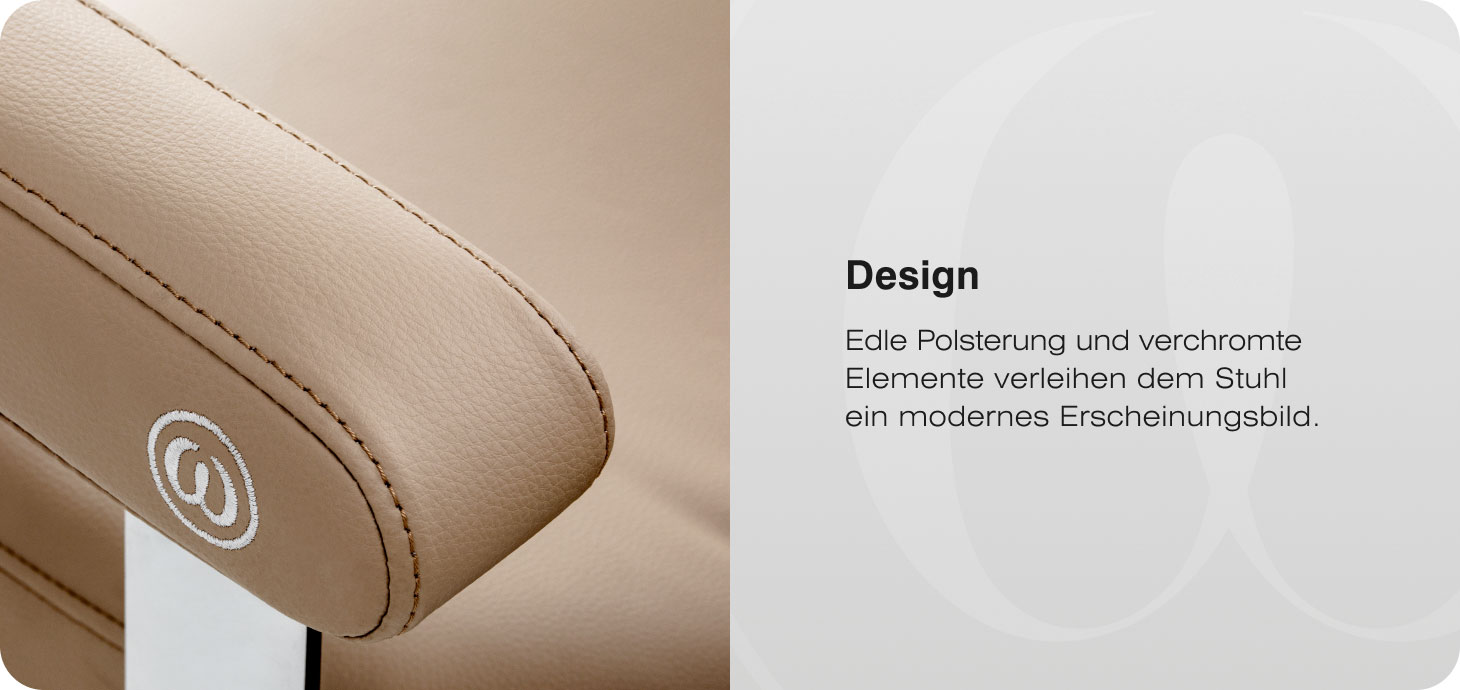 Der Stuhl zeichnet sich durch ein modernes, elegantes Design aus, das den professionellen Charakter des Salons unterstreicht und sich perfekt in die Gestaltung moderner Friseursalons einfügt. Die Polsterung aus hochwertigem Kunstleder in einem stilvollen Beigeton verleiht dem Ganzen Leichtigkeit und Eleganz und setzt gleichzeitig einen angenehmen, ästhetischen Akzent im Salon. Das Bezugsmaterial zeichnet sich durch Langlebigkeit, Feuchtigkeitsbeständigkeit und Pflegeleichtigkeit aus, was im täglichen Gebrauch in einem Friseursalon von besonderer Bedeutung ist. Verchromte Konstruktionselemente unterstreichen das moderne Design des Stuhls , und der stabile, runde Sockel sorgt für einen soliden Halt und eine ästhetische Abrundung der gesamten Form.