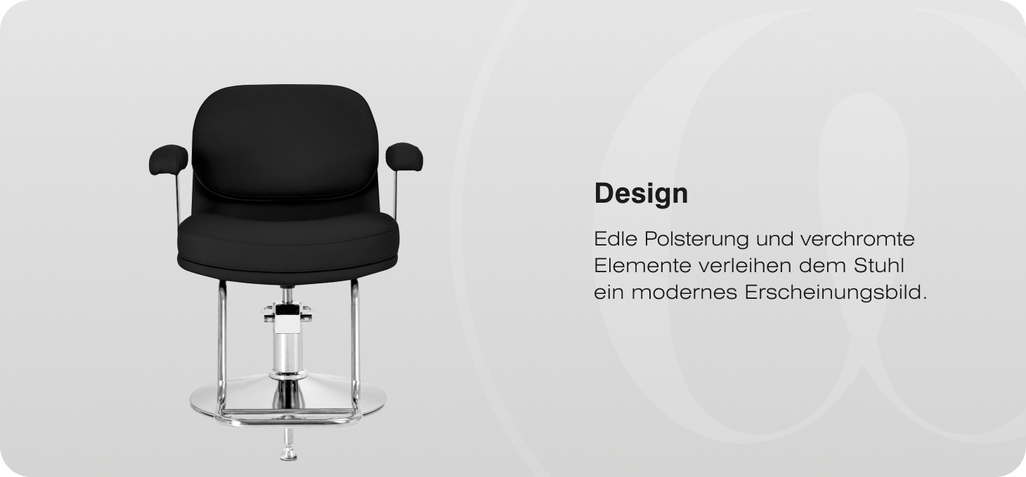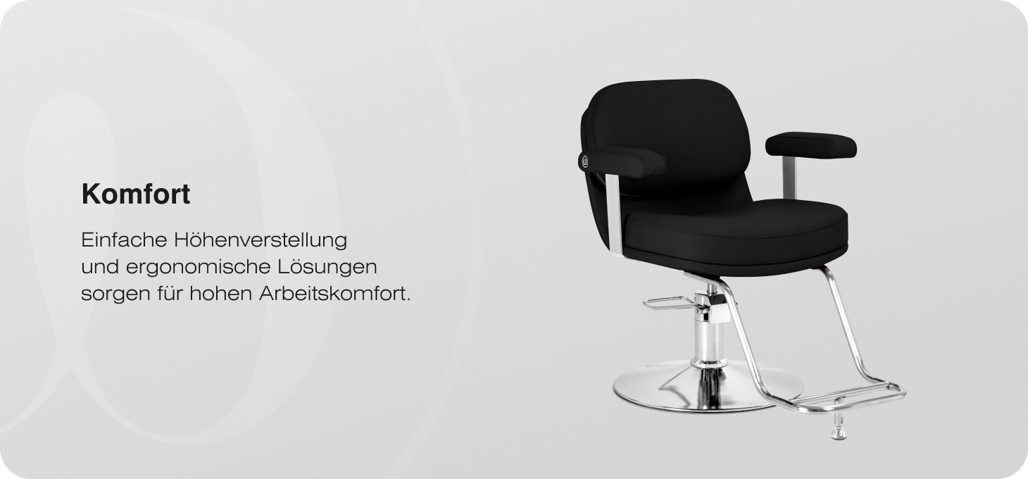 Die Konstruktion des Stuhls sorgt für Komfort auch bei längeren Behandlungen. Die entsprechend geformte Sitzfläche fördert eine bequeme Körperhaltung, und die ergonomischen, gepolsterten Armlehnen bieten eine stabile Stütze für die Arme. Die breite Sitzfläche erhöht den Komfort für den Kunden. Der Vollschwenkmechanismus erhöht die Bewegungsfreiheit des Stylisten und erleichtert das Manövrieren um den Stuhl herum.