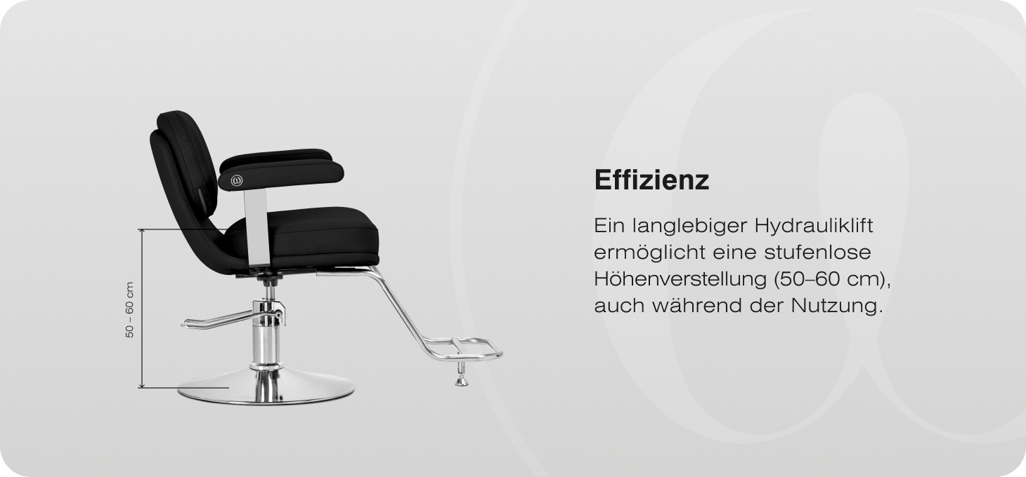 Der robuste hydraulische Hubsystem ermöglicht eine stufenlose Sitzhöhenverstellung im Bereich von 50–60 cm, auch während der Nutzung des Stuhls. Dies fördert die Arbeitsergonomie und ermöglicht eine einfache Anpassung der Position sowohl an die Körpergröße des Kunden als auch an die des Friseurs. Die konturierte Rückenlehne sorgt für eine angemessene Stütze des Rückens und eine bequeme Position während der Behandlungen. Die integrierte Fußstütze bietet einen stabilen Halt für die Füße und erhöht den Komfort für den Benutzer.
