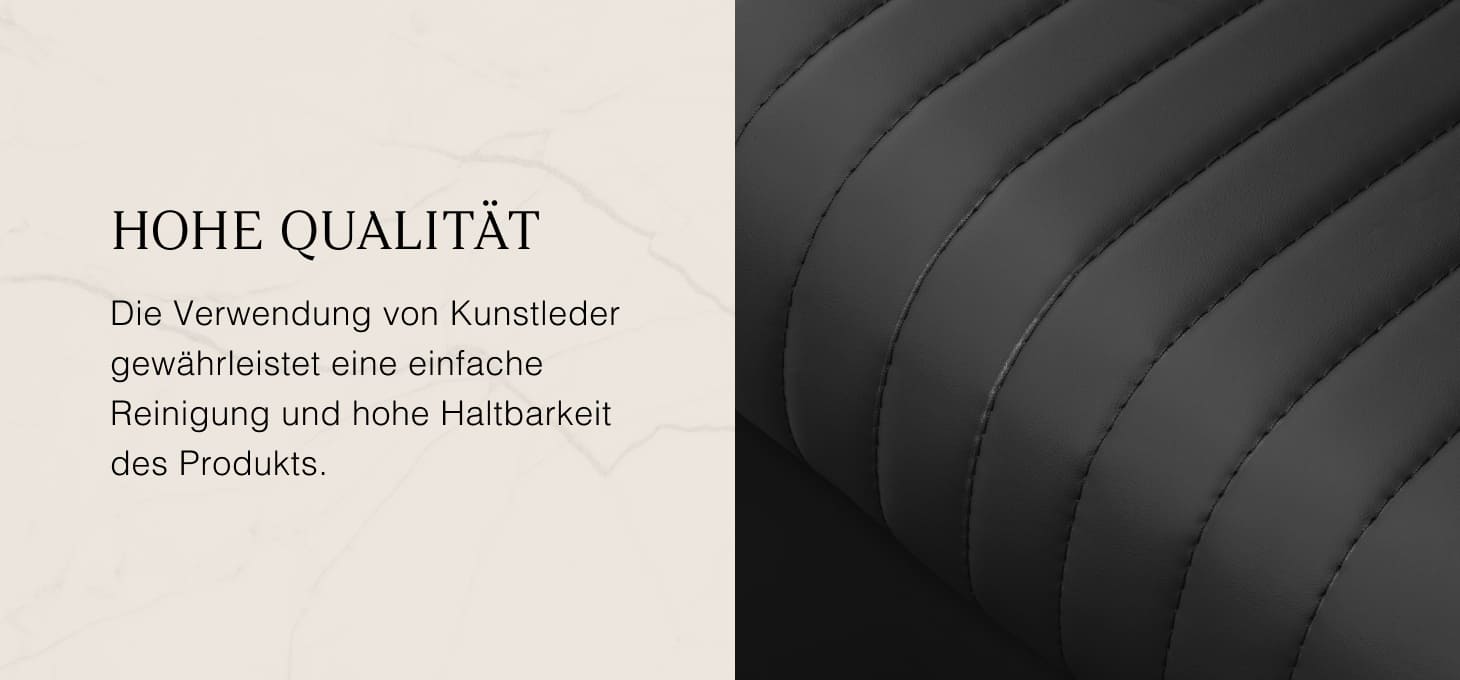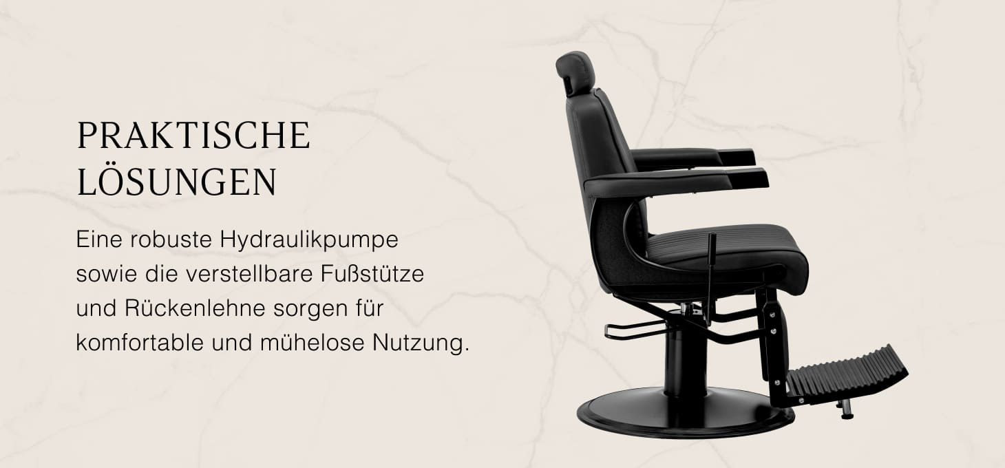 Die solide Konstruktion des Sockels sorgt für Stabilität und hohen Nutzungskomfort. Der Sitz ist mit verformungsbeständigem Schaumstoff gefüllt und mit weichem, mattem Kunstleder bezogen, das Langlebigkeit mit Komfort verbindet. Die für die Verarbeitung verwendeten Materialien sind feuchtigkeitsbeständig, langlebig und leicht zu reinigen, was den Sessel perfekt für die tägliche Arbeit macht. Stilvolle Nähte und Polsterungen in Schwarztönen verleihen ihm einen einzigartigen Charakter, der perfekt zum Dekor moderner Friseursalons passt.