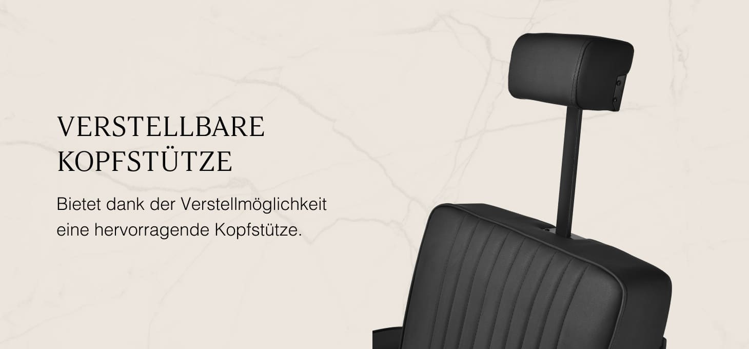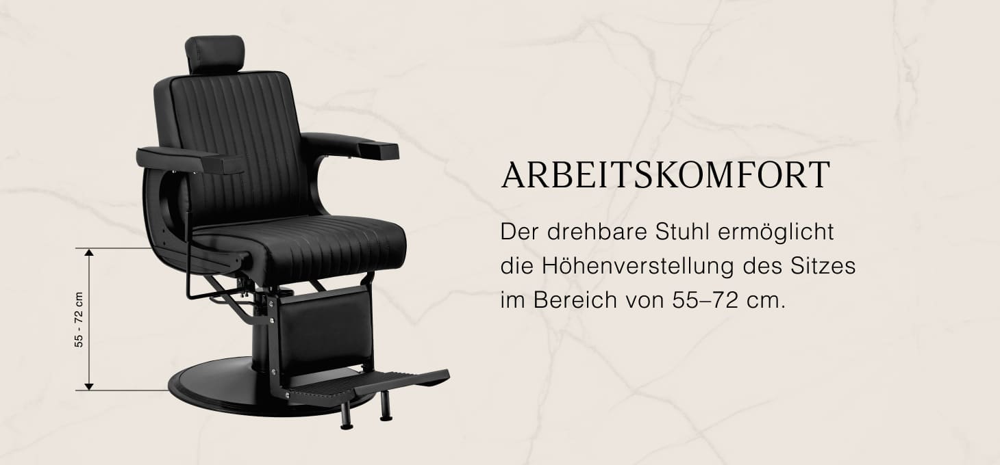 Mit dem effizienten hydraulischen Hub können Sie die Höhe des Sitzes von 55 bis 72 cm frei einstellen, auch wenn der Kunde bereits auf dem Stuhl sitzt. Auf diese Weise kann der Stuhl ergonomisch an die Körpergröße des Kunden und die Vorlieben der Person, die den Eingriff durchführt, angepasst werden. Die verstellbare Rückenlehne und die verstellbare Fußstütze ermöglichen es dem Kunden, ihn in eine bequeme, verstellbare Position zu bringen, um einen einfachen Zugang für präzisere Dienstleistungen zu ermöglichen. Für zusätzlichen Halt sorgt eine versenkbare Kopfstütze, die eine stabile Kopfstütze garantiert.