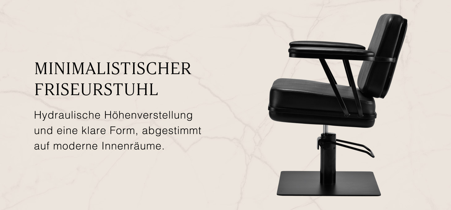 Der ergonomisch geformte Stuhl bietet Lendenwirbelstütze und hohen Sitzkomfort, während die gepolsterten Armlehnen eine korrekte Schulterposition des Kunden ermöglichen. Der stabile, quadratische Sockel in mattem Schwarz unterstreicht das stilvolle Erscheinungsbild. Die angenehme synthetische Lederpolsterung in Schwarztönen garantiert Komfort bei langen Behandlungen, Langlebigkeit, Feuchtigkeitsbeständigkeit und einfache Reinigung. Das moderne Design verleiht dem Interieur einen besonderen Charakter und passt sowohl zu modernen als auch zu klassischen Einrichtungen, wodurch das professionelle Image des Salons betont wird.