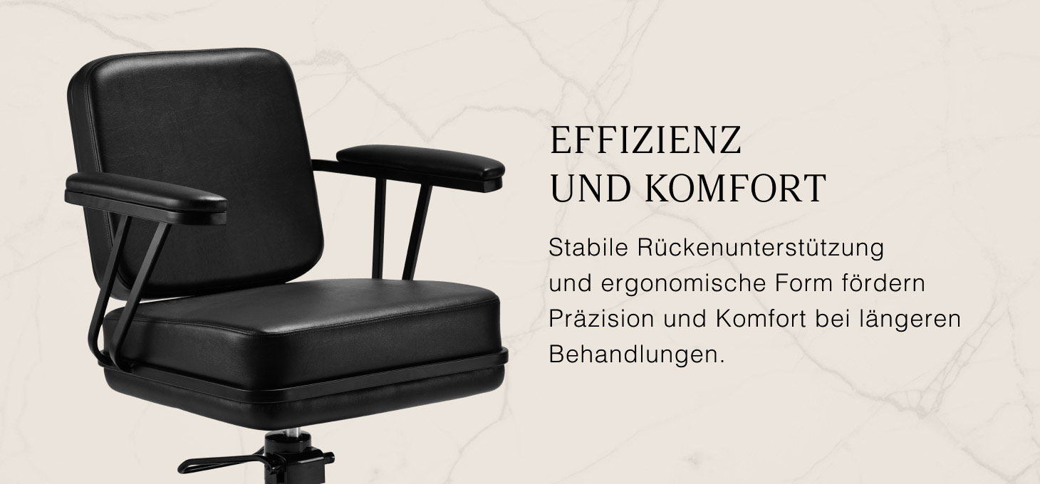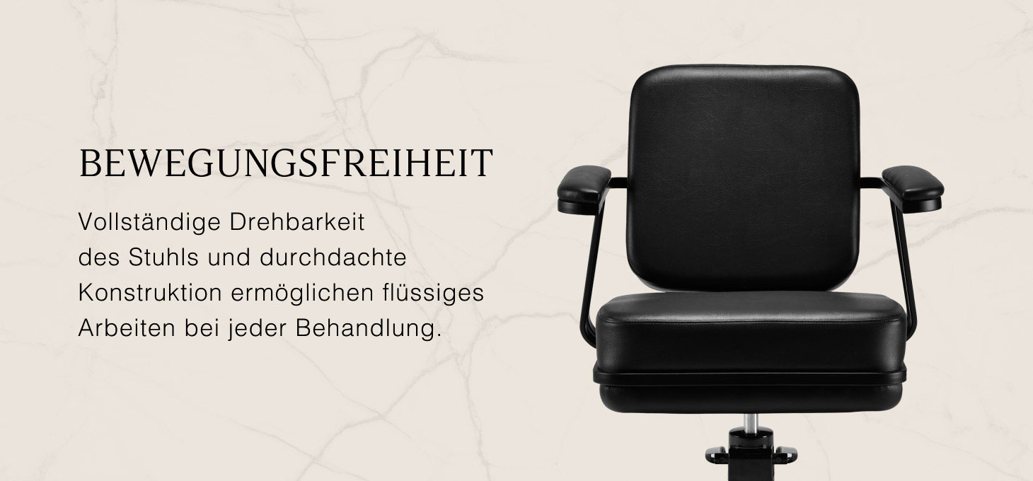 Die Konstruktion des Stuhls wurde mit Blick auf Komfort auch bei längeren Behandlungen entwickelt. Die geformte Sitzfläche und die ergonomischen Armlehnen unterstützen eine natürliche Körperhaltung des Kunden und erleichtern präzises Arbeiten. Der Vollrotationsmechanismus erweitert den Bewegungsradius und die Manövrierfreiheit, was zu einem flüssigen und effizienten Arbeitsablauf beiträgt.