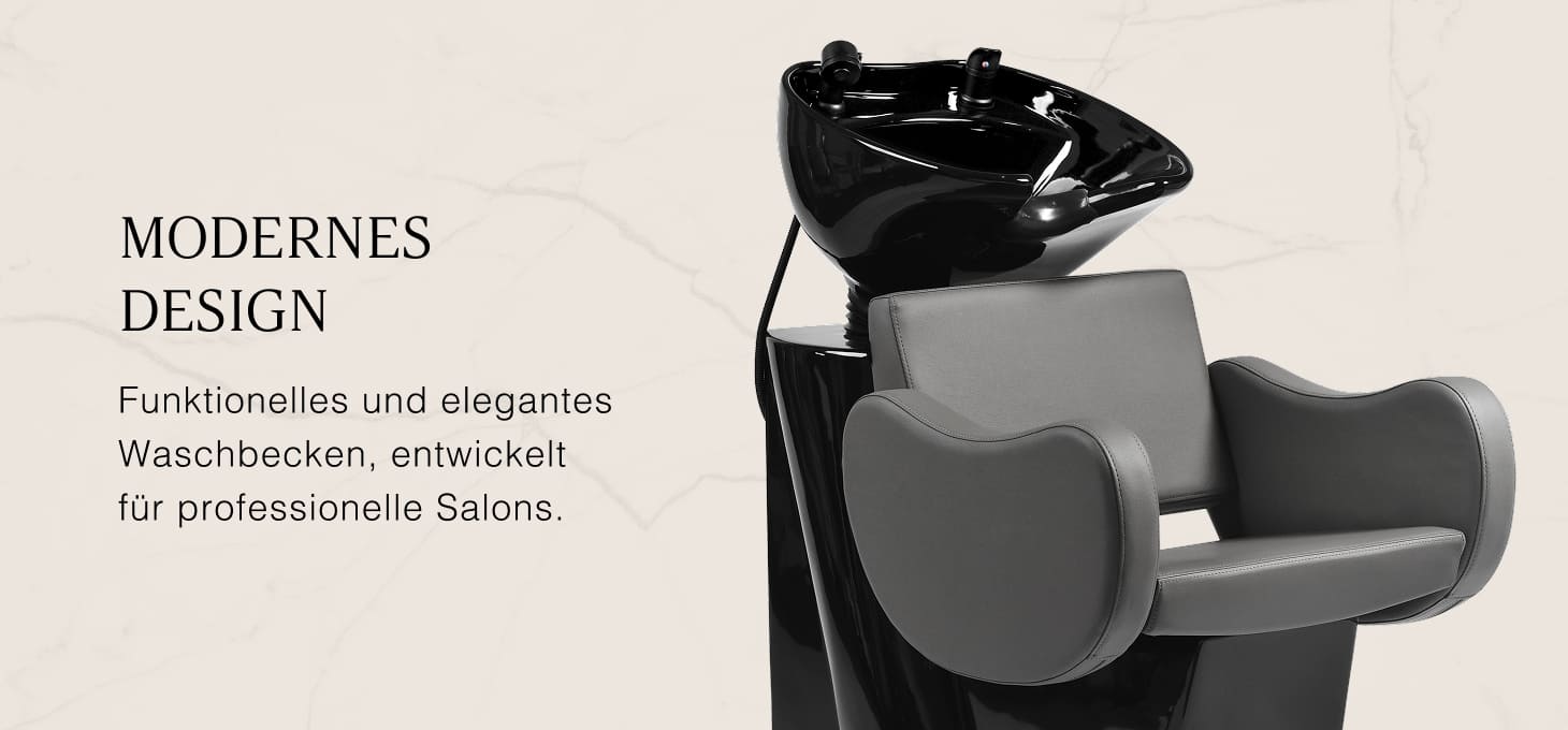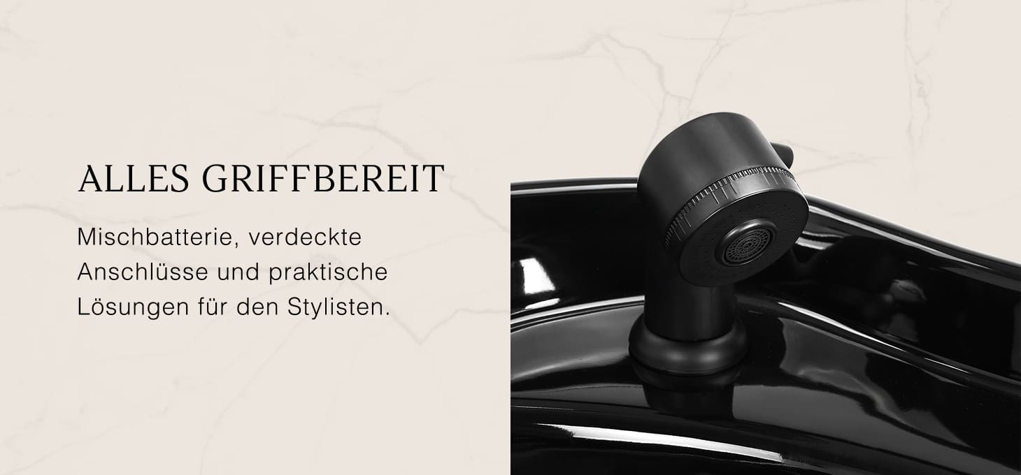 Die Keramikschale in Schwarztönen ist tief, was das Spritzen von Wasser und Produkten, die während der Behandlungen verwendet werden, reduziert. Der einstellbare Neigungswinkel der Schüssel ermöglicht es, sie an die individuellen Bedürfnisse anzupassen, und das verwendete Material macht das Waschbecken langlebig, resistent gegen Verfärbungen und Kratzer und leicht sauber zu halten. Der ergonomisch geformte Kragen garantiert eine komfortable Kopfstütze, während der weiche Kunststoffaufzug in Schwarztönen das Gefühl einer kalten Keramikoberfläche eliminiert.