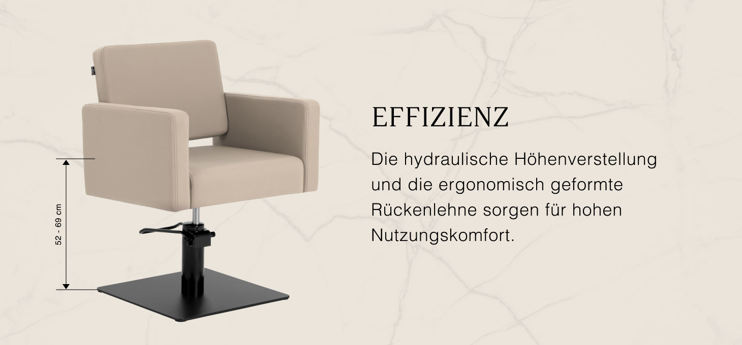 Der robuste Hydrauliklift ermöglicht eine stufenlose Höhenverstellung der Sitzfläche im Bereich von 52–69 cm, auch während der Nutzung. Dies fördert ergonomisches Arbeiten und erlaubt eine einfache Anpassung an die Körpergröße von Kunde und Friseur. Die profilierte Rückenlehne bietet eine stabile Rückenunterstützung und sorgt für eine bequeme Sitzposition, was insbesondere bei längeren Behandlungen den Komfort und die Zufriedenheit des Kunden erhöht.