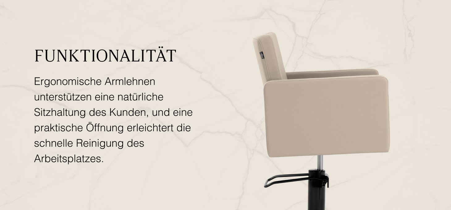 Die durchdachte Konstruktion gewährleistet Komfort auch bei längeren Behandlungen. Die ergonomisch geformte Sitzfläche und die Armlehnen unterstützen eine natürliche Körperhaltung des Kunden und erleichtern präzises Arbeiten. Der Vollrotationsmechanismus erhöht den Bewegungsradius und die Manövrierfreiheit, was die Effizienz der Dienstleistungen steigert. Die praktische Öffnung zwischen Sitzfläche und Rückenlehne ermöglicht ein schnelles Entfernen von Haaren und eine einfache Reinigung des Arbeitsplatzes.