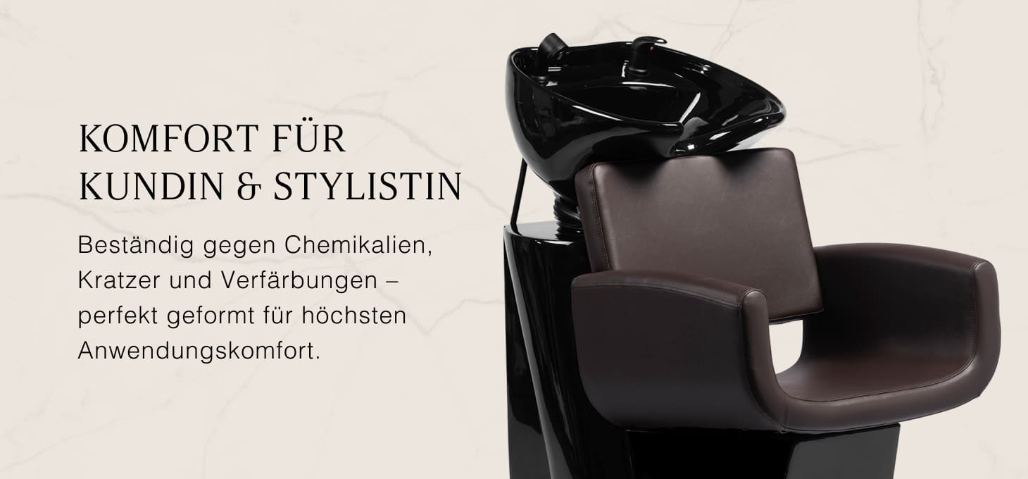 Die tiefe, keramische Schale in Schwarztönen reduziert das Spritzen von Wasser und Kosmetika, die während der Behandlungen verwendet werden. Durch den einstellbaren Neigungswinkel können Sie die Position an Ihre individuellen Bedürfnisse anpassen. Das strapazierfähige Material bietet Beständigkeit gegen Verfärbungen, Kratzer und Chemikalien, und die glatte Oberfläche macht es einfach, es sauber zu halten. Der ergonomisch geformte Kragen garantiert eine komfortable Kopfstütze.