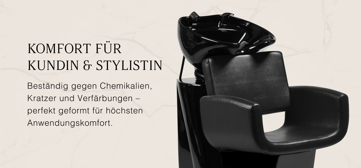 Die tiefe, keramische Schale in Schwarztönen reduziert das Spritzen von Wasser und Kosmetika, die während der Behandlungen verwendet werden. Durch den einstellbaren Neigungswinkel können Sie die Position an Ihre individuellen Bedürfnisse anpassen. Das strapazierfähige Material bietet Beständigkeit gegen Verfärbungen, Kratzer und Chemikalien, und die glatte Oberfläche macht es einfach, es sauber zu halten. Der ergonomisch geformte Kragen garantiert eine komfortable Kopfstütze.