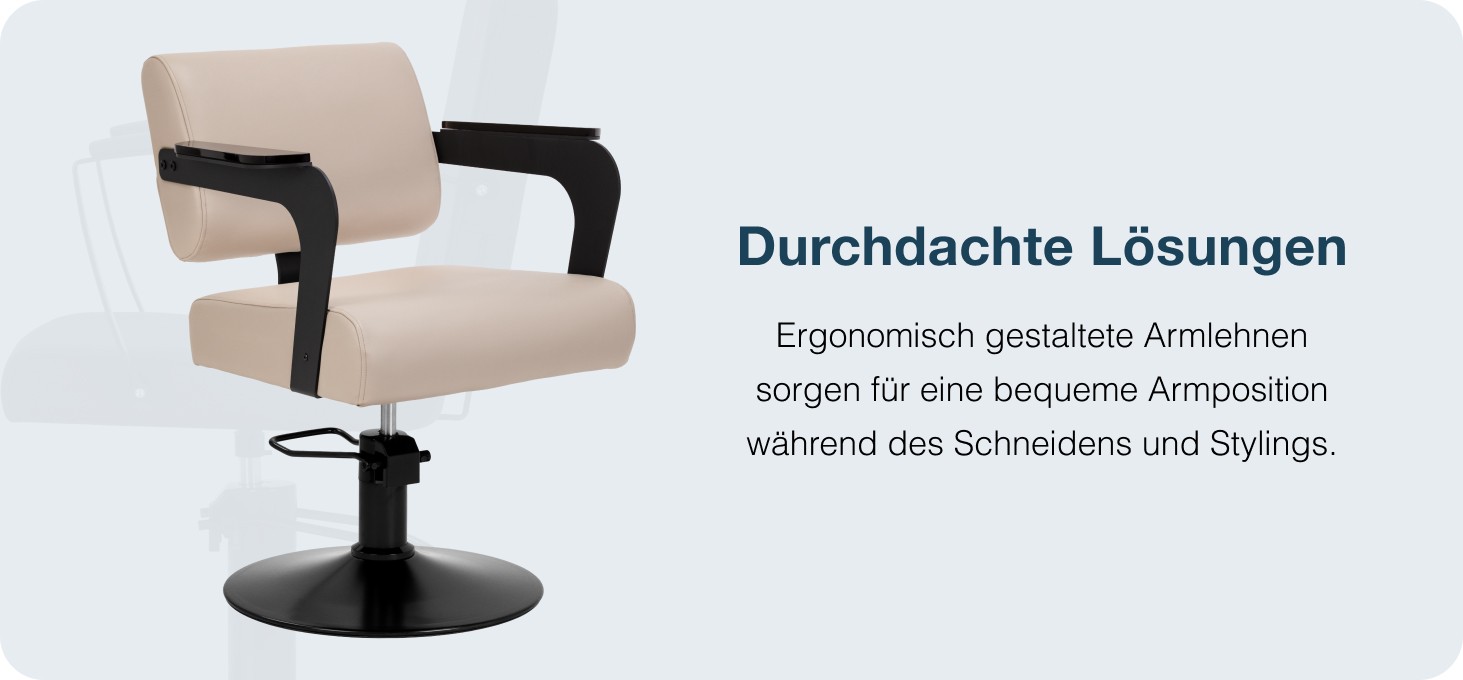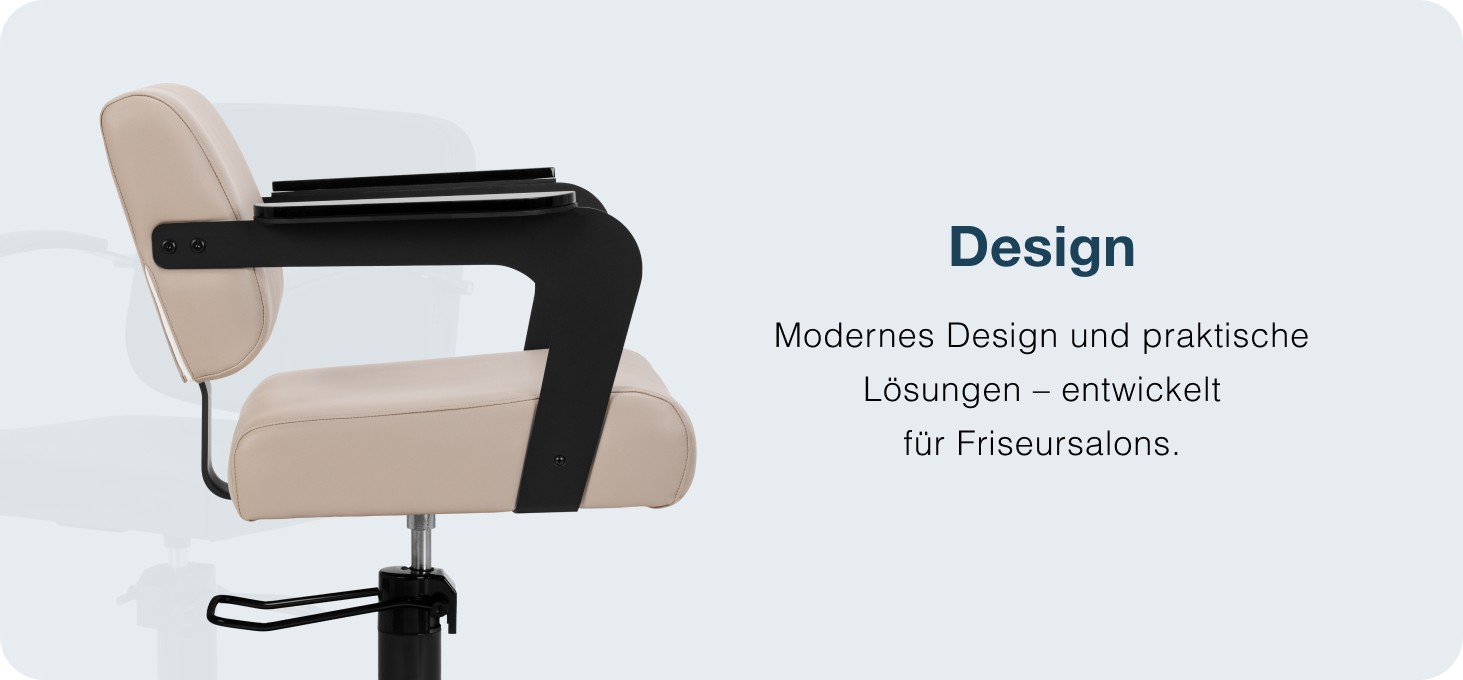 Der Vollrotationsmechanismus erleichtert die Arbeit des Friseurs und erhöht die Bewegungsfreiheit während der Behandlungen. Der stabile, runde Sockel garantiert Standfestigkeit im Gebrauch. Die bequeme Sitzfläche sorgt auch bei mehrstündigen Behandlungen für hohen Komfort. Die modern geformten Armlehnen bestehen aus einer Kombination aus Metall und Acryl mit halbtransparenter Oberfläche. Sichtbare Konstruktionselemente verleihen dem Stuhl einen originellen Charakter. Die optimale Höhe der Armlehnen unterstützt eine natürliche Schulterhaltung des Kunden und erhöht den Komfort beim Schneiden und Stylen.