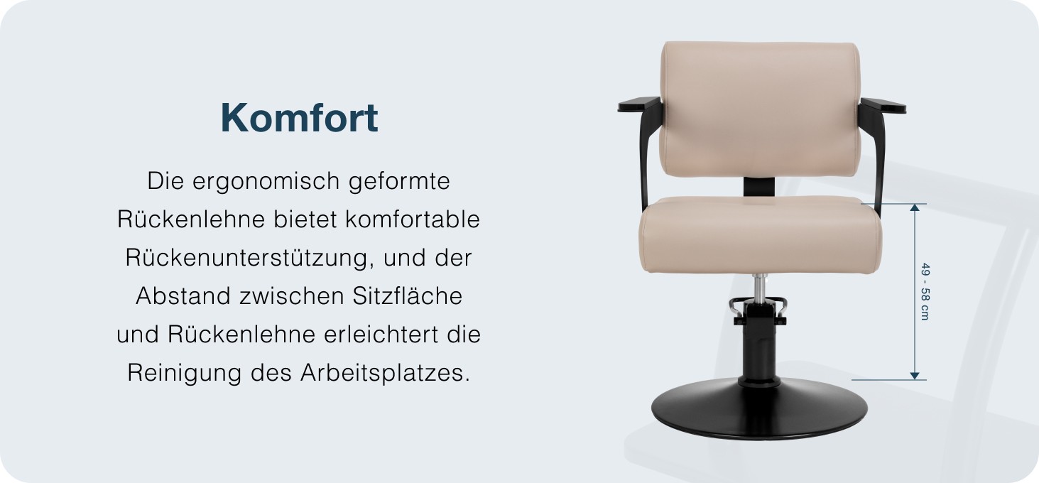 Der leistungsstarke hydraulische Lift ermöglicht eine präzise Höhenverstellung der Sitzfläche im Bereich von 49–58 cm, was eine komfortable Positionierung des Stuhls und ergonomisches Arbeiten erlaubt. Die profilierte Rückenlehne bietet eine optimale Unterstützung des Rückens und sorgt auch bei längeren Salonbesuchen für eine bequeme Sitzposition. Der Zwischenraum zwischen Sitzfläche und Rückenlehne erleichtert die Sauberkeit am Arbeitsplatz und ermöglicht ein schnelles sowie gründliches Entfernen von Haaren.