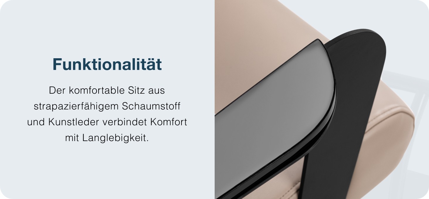 Die Sitzfläche ist mit langlebigem, formbeständigem Schaumstoff gefüllt, und der Bezug aus Kunstleder gewährleistet Komfort sowie eine lange Lebensdauer. Die Materialien sind feuchtigkeitsbeständig, leicht zu reinigen und für den intensiven Salonbetrieb geeignet. Der Bezug in Beigetönen verleiht dem Stuhl einen eleganten, zeitlosen Charakter, der harmonisch mit den schwarzen Konstruktionselementen kombiniert ist. Das moderne Design macht den Friseurstuhl Hair System Jet zu einer ästhetischen und funktionalen Ausstattung professioneller Friseursalons.