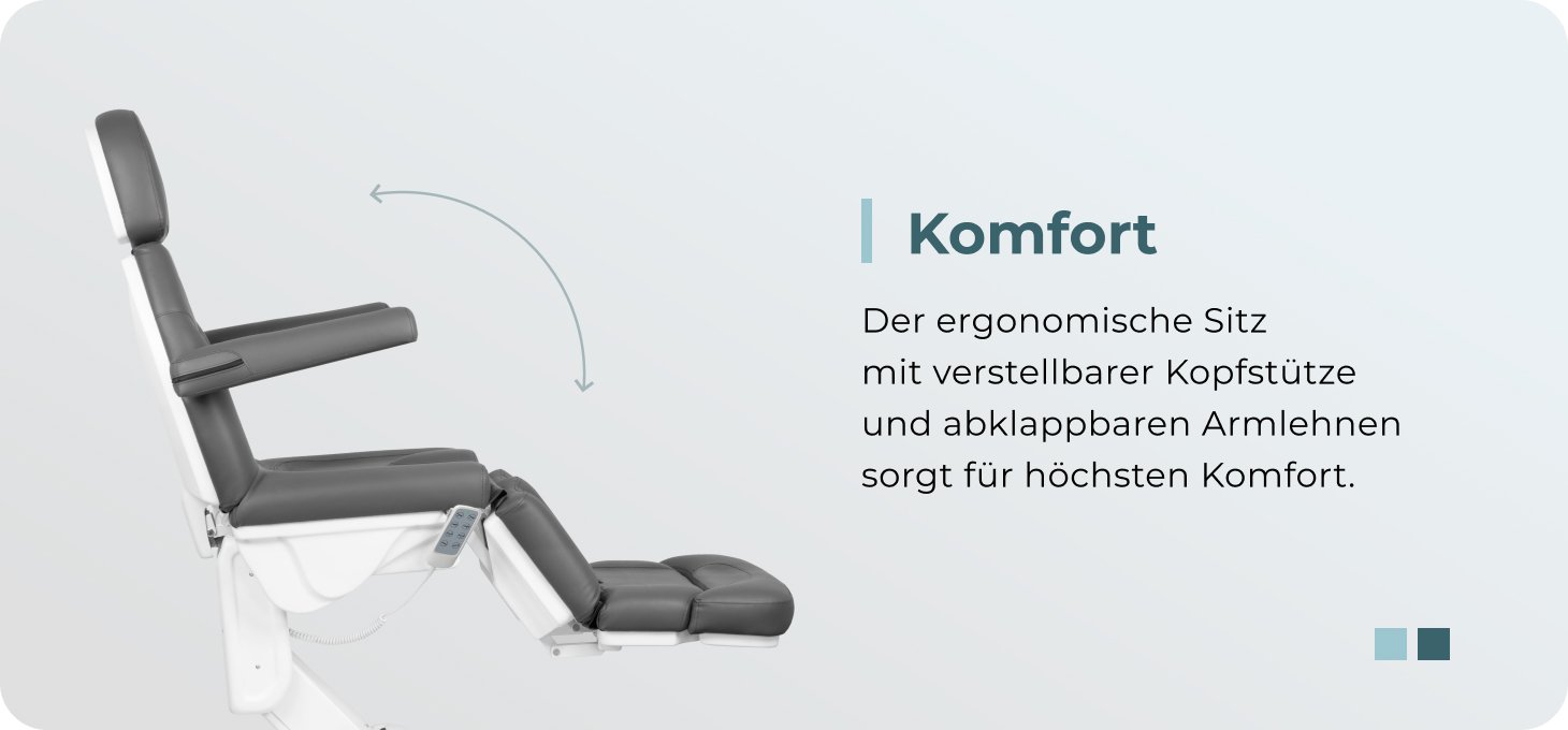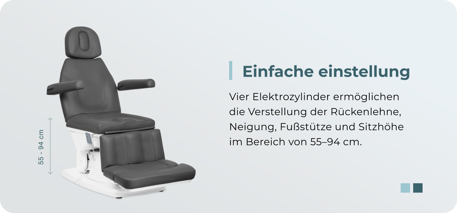 Der Sitz lässt sich bequem über die intuitive kabelgebundene Fernbedienung verstellen, die eine reibungslose Steuerung in vier Ebenen ermöglicht: Höhe, Rückenlehnenneigung, Halterung und Fußstütze. Der Höhenverstellbereich des Sitzes reicht von 55 cm bis 94 cm, so dass Sie die Position an die Körpergröße des Spezialisten und die Art der durchgeführten Behandlung anpassen können. Im vollständig ausgeklappten Zustand erreicht der Stuhl eine Länge von über 200 cm, wodurch er Komfort für Benutzer unterschiedlicher Körpergröße bietet. Für mehr Komfort kann die Fernbedienung am Sitz an den Griff gehängt werden, wodurch sie während der Arbeit nicht stört. Optional kann ein Fußschalter angeschlossen werden (Code 133026).