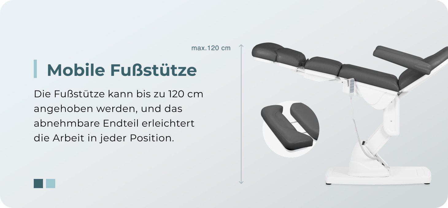 Eine speziell entwickelte Fußstütze erleichtert die Durchführung von Pediküre und Podologie erheblich. Er ist breit und stabil und dank der elektrischen Fernbedienung können Sie den Neigungswinkel stufenlos einstellen. Diese Lösung ermöglicht eine bequeme Unterstützung der Beine und ihre richtige Positionierung in verschiedenen Positionen, was den Komfort sowohl des Kunden als auch der Person, die den Eingriff durchführt, erhöht. Durch die Möglichkeit, die Fußstütze zu verlängern, passt sich der Stuhl perfekt an größere Benutzer an und bietet ihnen eine angemessene Unterstützung. Dank der Möglichkeit, den hinteren Teil der Fußstütze abzunehmen, erhält der Fachmann uneingeschränkten Zugang zu den Füßen und Zehen, was ihm mehr Komfort und Präzision bei anspruchsvollen Eingriffen verschafft. Wenn der Sitz maximal angehoben ist, wird die Fußstütze gerade gerichtet und die Wiege gekippt, ihre Höhe beträgt ca. 120 cm, was zusätzlich ein präzises Arbeiten bei spezialisierten podologischen Behandlungen erleichtert.