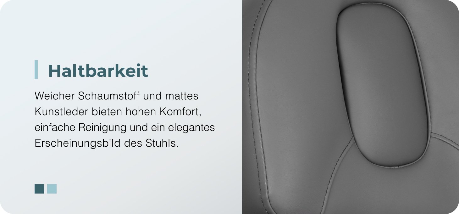 Die weiche Schaumstofffüllung und die Polsterung aus angenehm anzufassendem, mattem Kunstleder in Grautönen garantieren Komfort und einfache Reinigung. Das Material ist resistent gegen Feuchtigkeit und die sorgfältig gefertigten Säume betonen den eleganten Charakter der Möbel. Die solide Konstruktion sorgt für Stabilität und Langlebigkeit, und das minimalistische Design in klassischen Farben lässt den Stuhl perfekt zur Einrichtung moderner Büros passen.