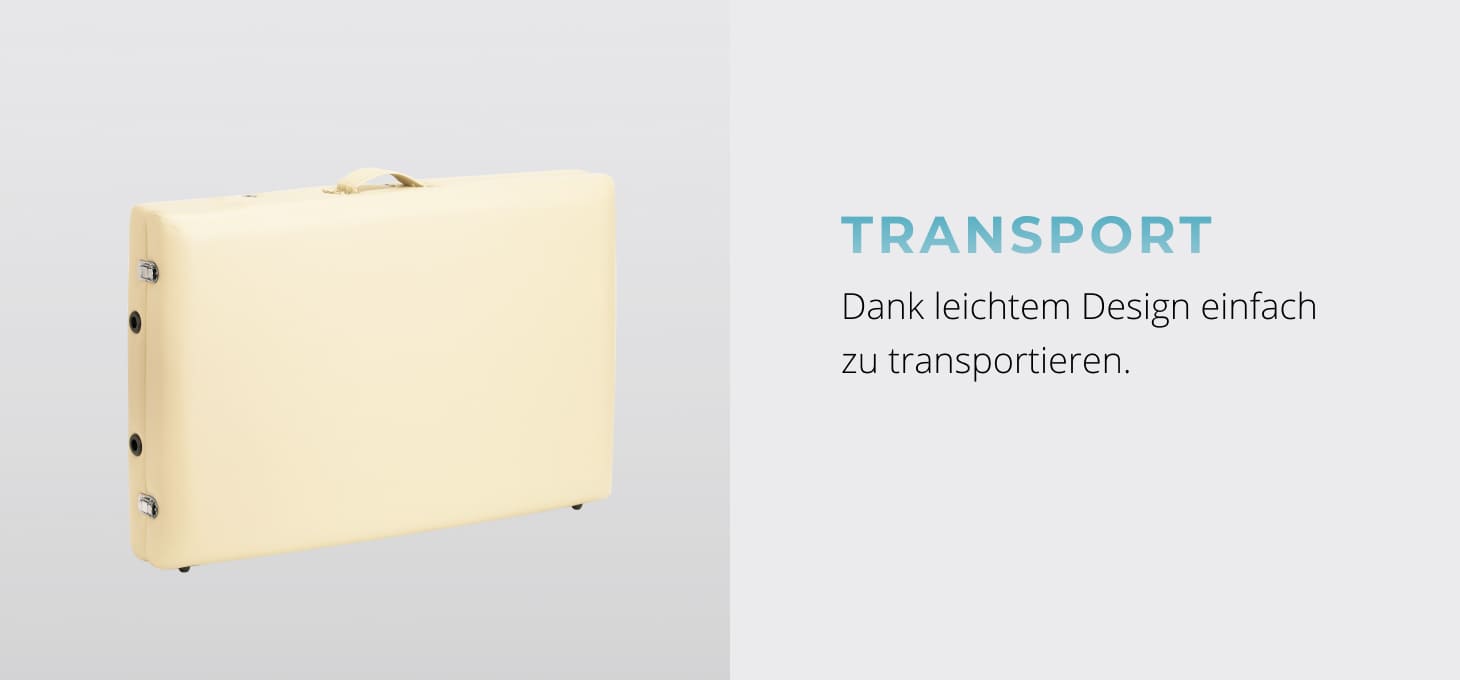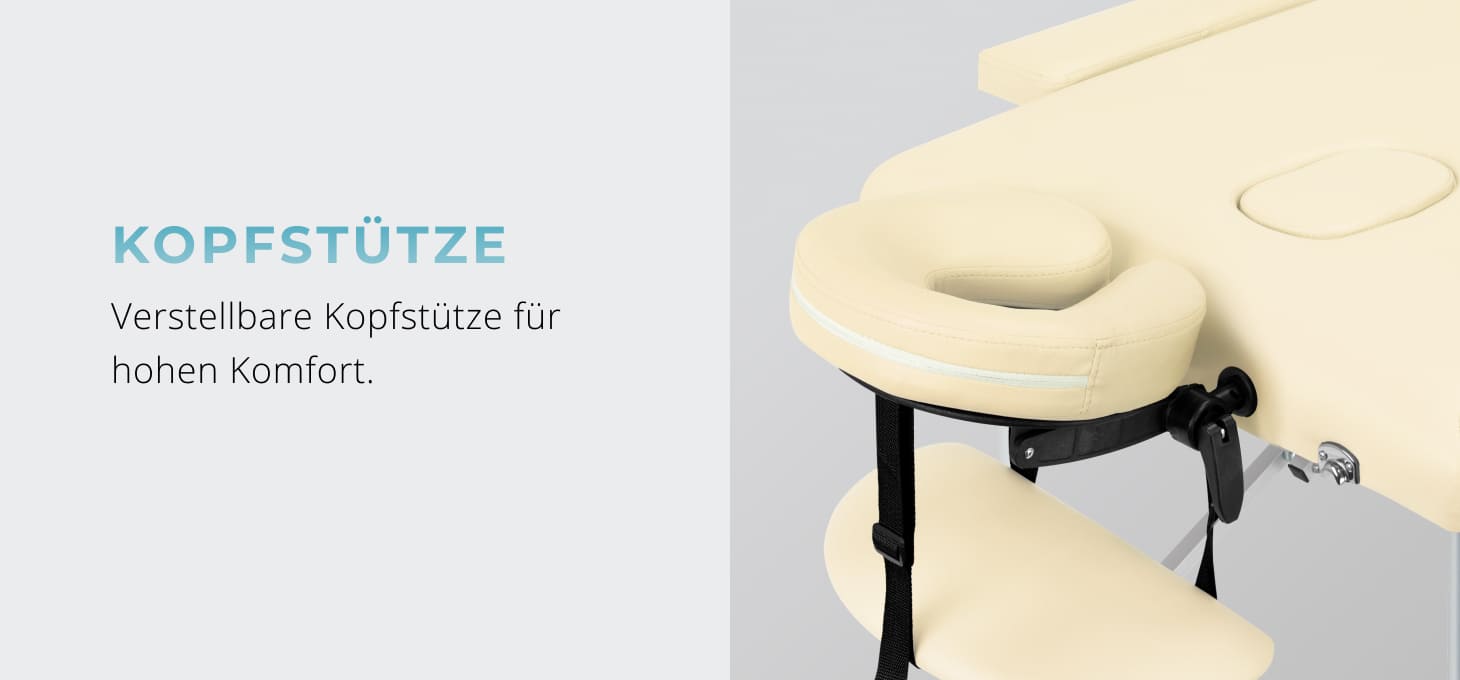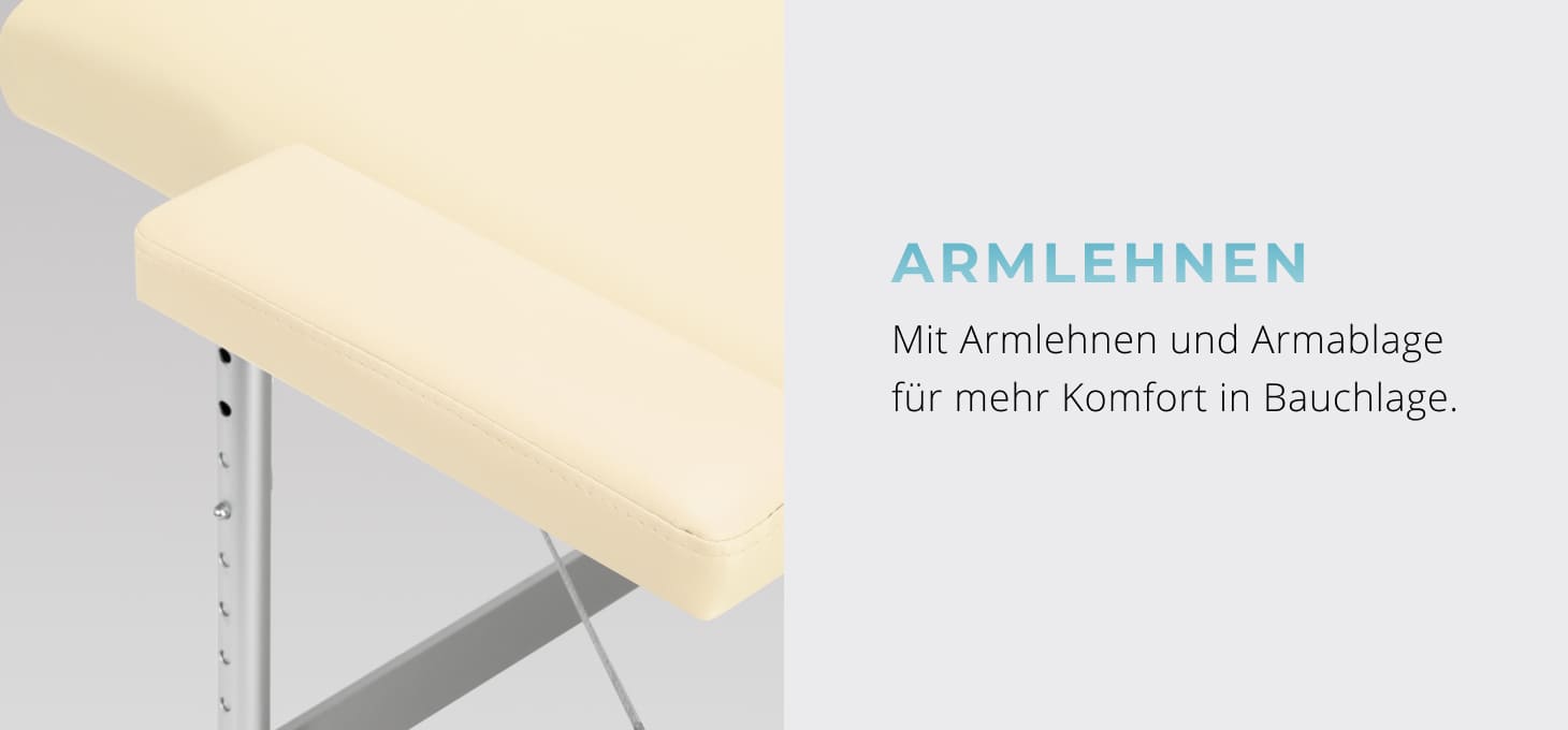 Lieferumfang: Massageliege, Armlehnen, verstellbare Kopfstütze, Armablage vorne, Endkappe, Tragetasche.