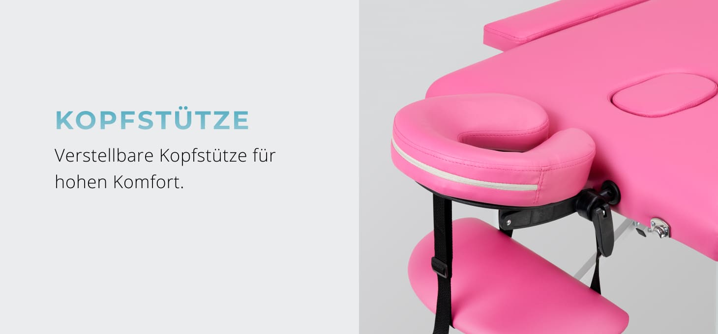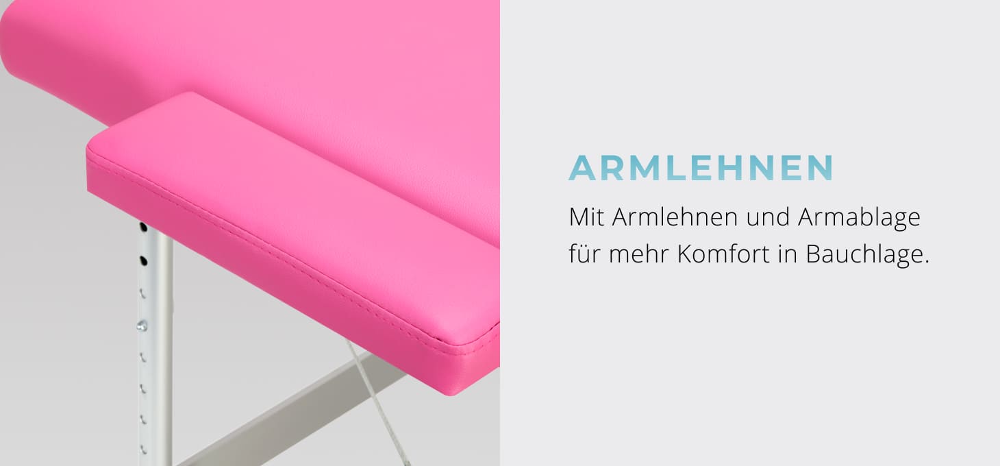 Lieferumfang: Massageliege, Armlehnen, verstellbare Kopfstütze, Armablage vorne, Endkappe, Tragetasche.