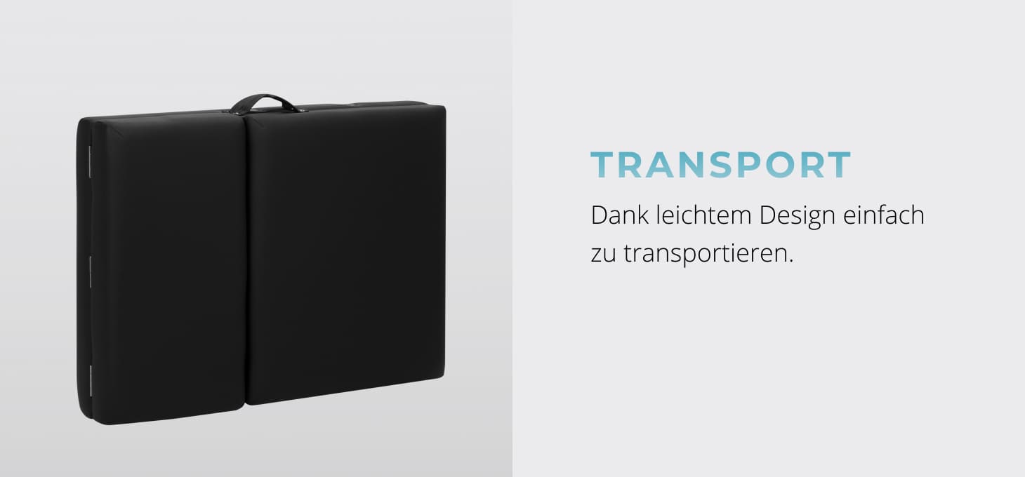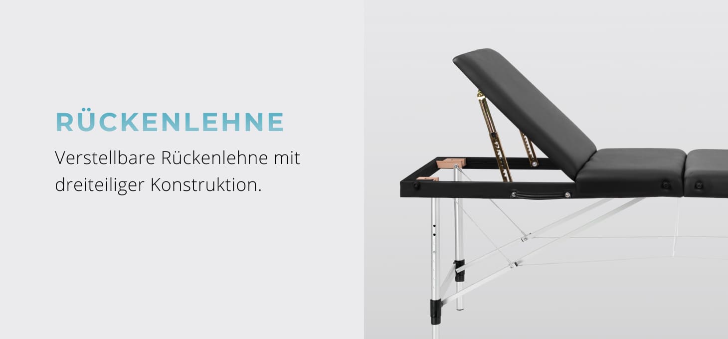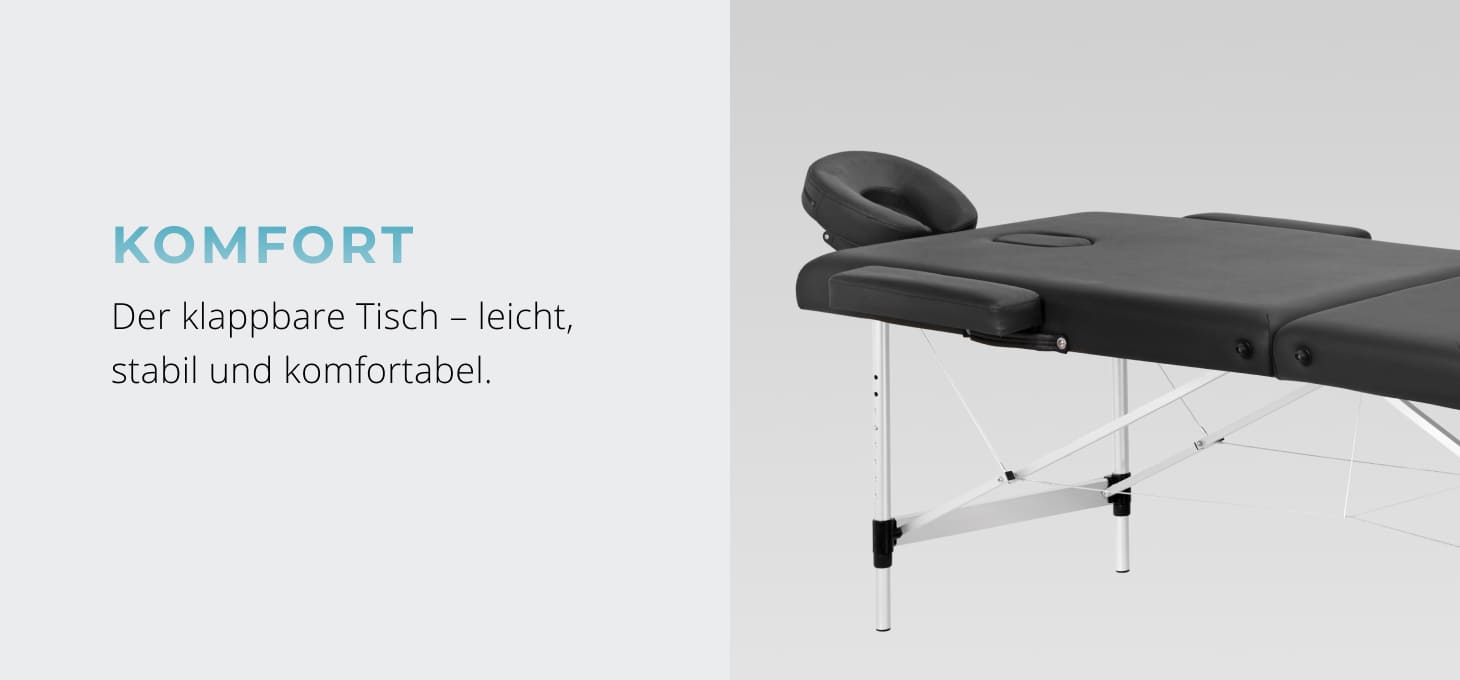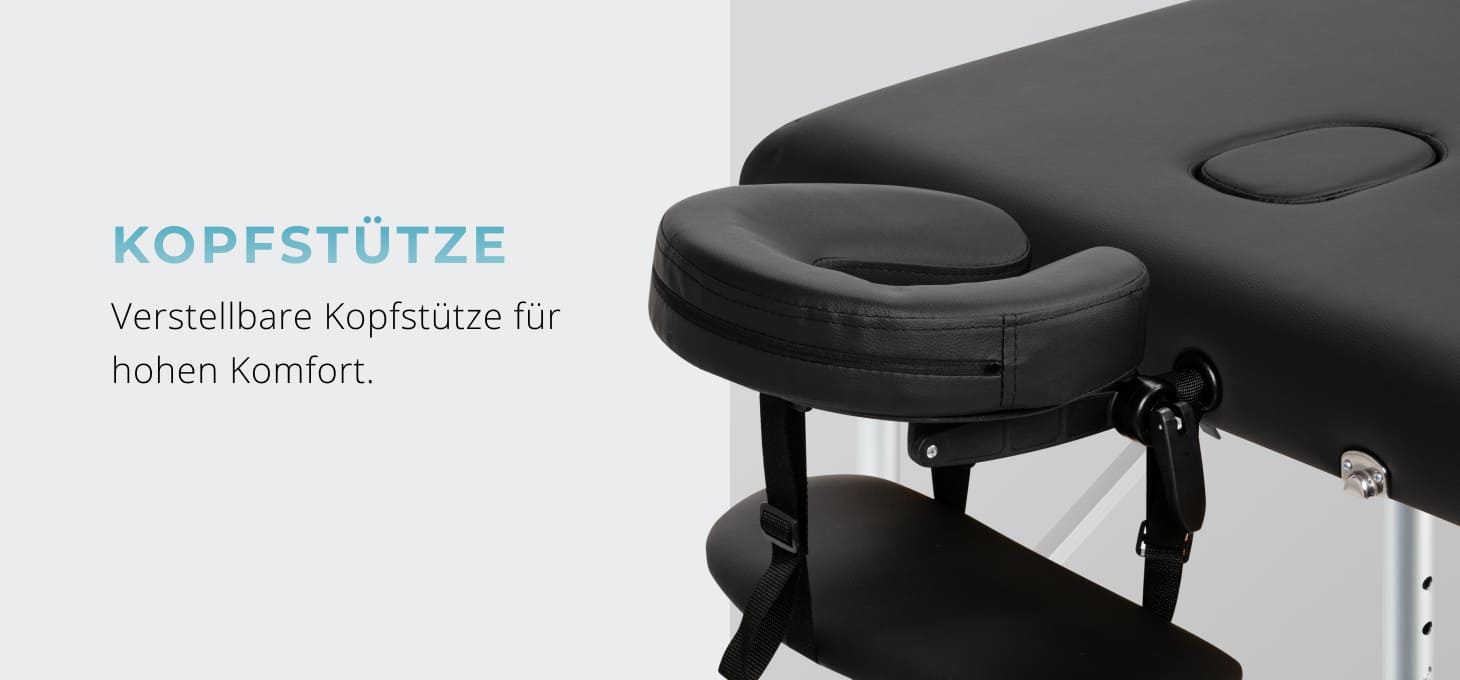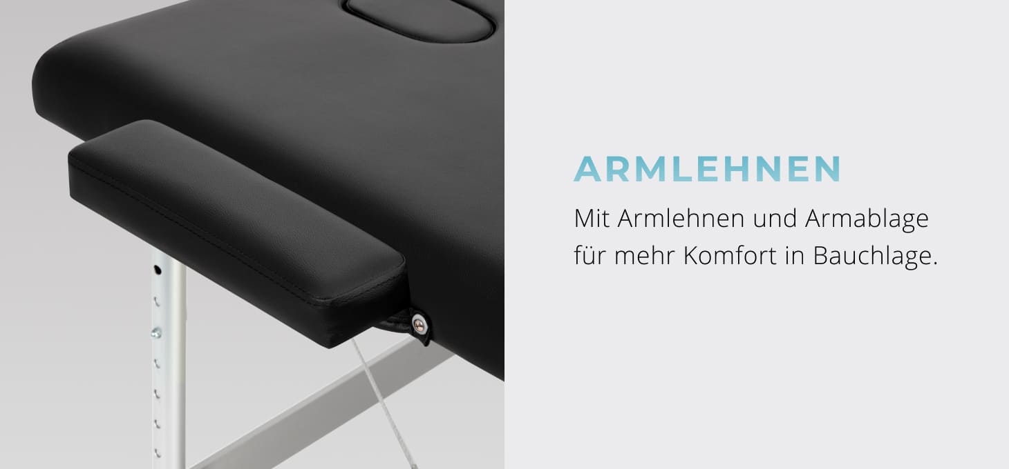 Lieferumfang: Massageliege, Armlehnen, verstellbare Kopfstütze, Armablage vorne, Endkappe, Tragetasche.