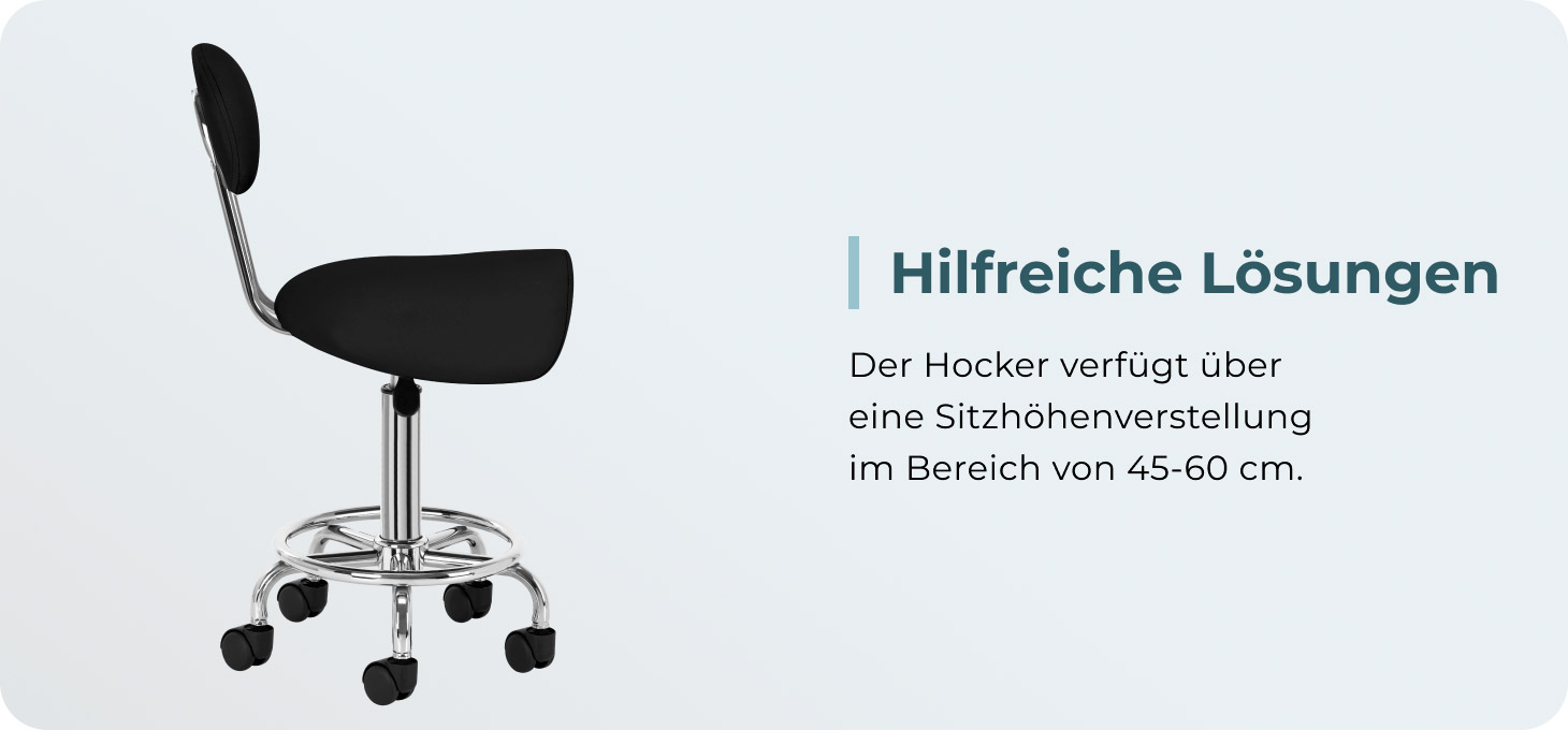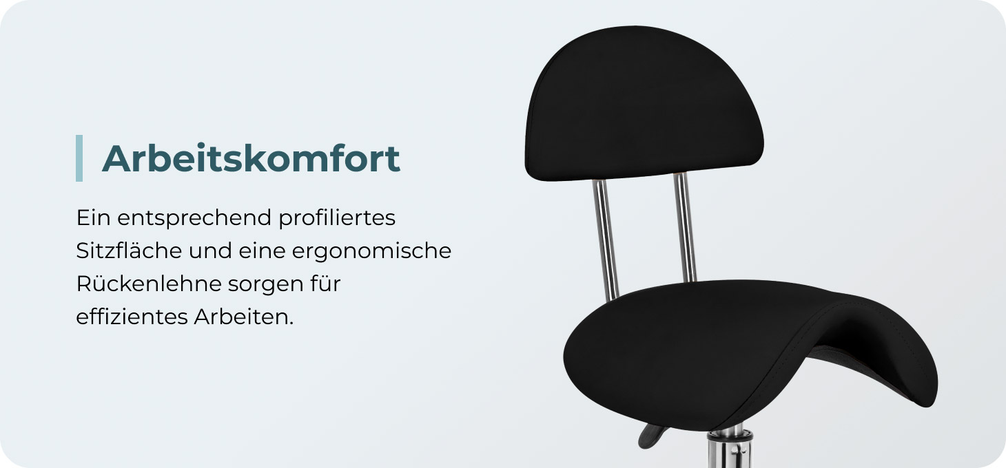 Die Möglichkeit, die Höhe des Sitzes im Bereich von 49-62 cm einzustellen, erleichtert dem Spezialisten die richtige Positionierung des Körpers während der Behandlungen. Der Sitz ist in Form eines Sattels profiliert und mit strapazierfähigem, verformungsbeständigem Schaumstoff gefüllt, der den Benutzern Komfort und Ergonomie bei der Arbeit garantiert. Die bequeme Rückenlehne bietet eine hervorragende Rückenstütze, unabhängig von der Körpergröße des Benutzers. Der Vollrotationsmechanismus macht das Arbeiten effizienter und komfortabler.
