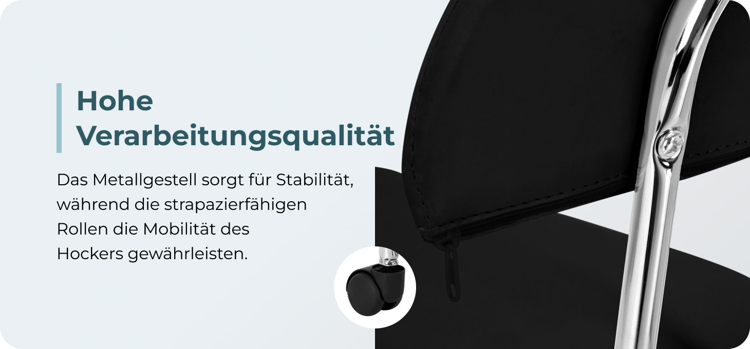 Der Fünf-Sterne-Sockel in Chromtönen ist mit Rädern ausgestattet, die eine beträchtliche Mobilität ermöglichen und das Verschieben der Möbel im Büro erleichtern. Die Polsterung des Hockers besteht aus angenehm anzufassendem Kunstleder in Schwarztönen. Dank der Verwendung dieses Materials ist der Hocker langlebig, feuchtigkeitsbeständig und leicht zu reinigen.