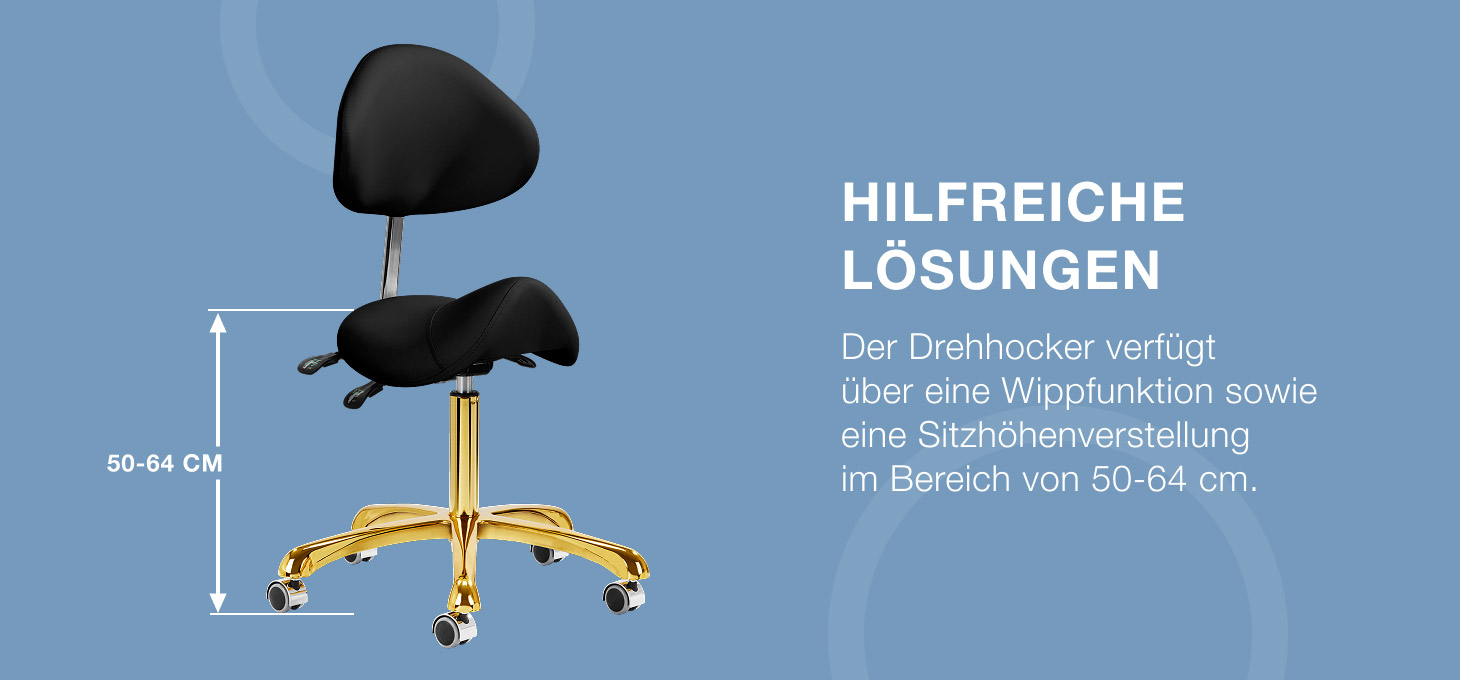 Die Möglichkeit, die Höhe des Sitzes im Bereich von 50-64 cm einzustellen, ermöglicht es dem Spezialisten, bei der Durchführung von Dienstleistungen die richtige Position einzunehmen. Die konturierte Rückenlehne, die um 20 cm verlängert werden kann, bietet eine hervorragende Rückenstütze, unabhängig von der Körpergröße des Benutzers. Der Vollrotationsmechanismus macht das Arbeiten effizienter und komfortabler. Der Stuhl verfügt außerdem über eine abschließbare Wiegefunktion, die eine ergonomische Körperpositionierung während der Arbeit ermöglicht. Ein richtig profilierter Sitz in Form eines Sattels, der mit verformungsbeständigem Schaumstoff gefüllt ist, garantiert dem Benutzer Komfort und Ergonomie bei der Arbeit.