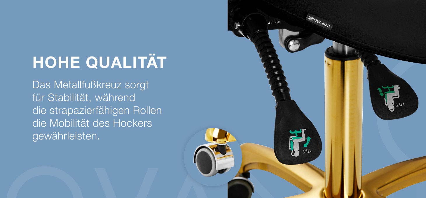 Der fünfarmige, passend gestaltete Sockel in Goldtönen macht den Hocker stabil, auch bei intensiver Arbeit. Die Räder sorgen für eine beträchtliche Mobilität, die es einfach macht, die Möbel im Büro zu bewegen. Die Polsterung des strapazierfähigen Hockers besteht aus Kunstleder in Schwarztönen. Dank der Verwendung dieses Materials ist der Hocker feuchtigkeitsbeständig und leicht zu reinigen.