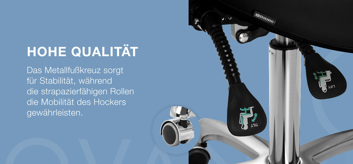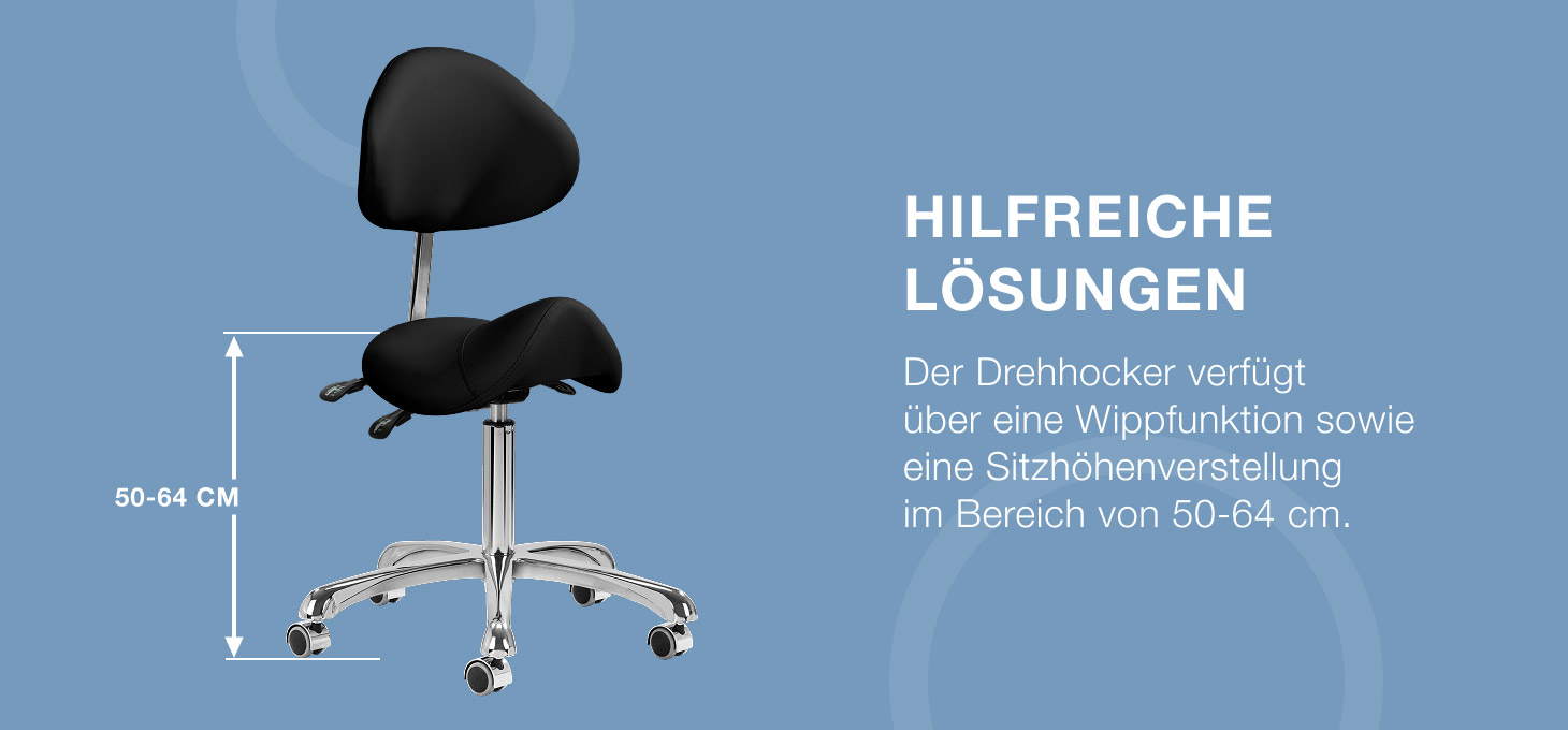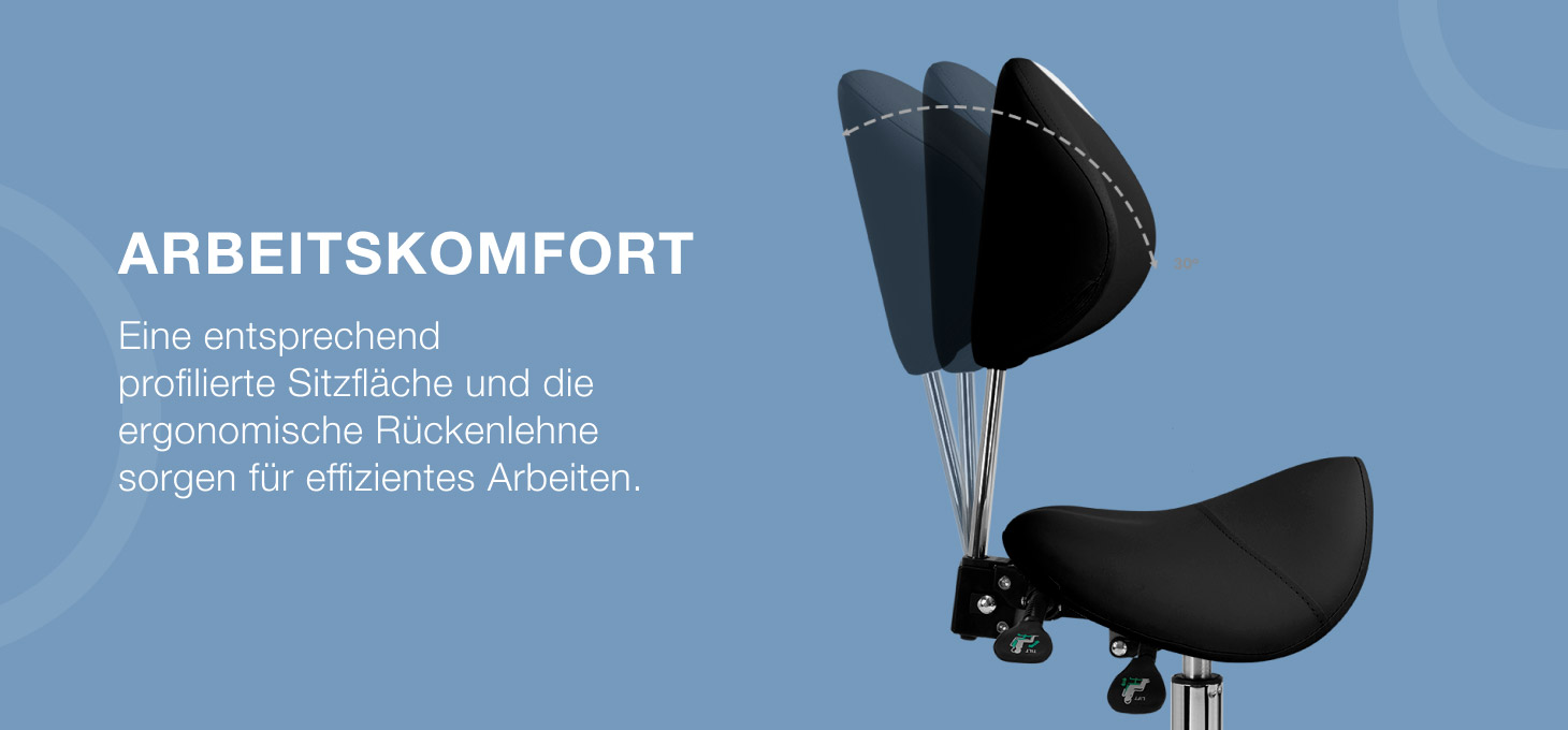 Die Möglichkeit, die Höhe des Sitzes im Bereich von 50-64 cm einzustellen, ermöglicht es dem Spezialisten, bei der Durchführung von Dienstleistungen die richtige Position einzunehmen. Die konturierte Rückenlehne, die um 20 cm verlängert werden kann, bietet eine hervorragende Rückenstütze, unabhängig von der Körpergröße des Benutzers. Der Vollrotationsmechanismus macht das Arbeiten effizienter und komfortabler. Der Stuhl verfügt außerdem über eine abschließbare Wiegefunktion, die eine ergonomische Körperpositionierung während der Arbeit ermöglicht. Ein richtig profilierter Sitz in Form eines Sattels, der mit verformungsbeständigem Schaumstoff gefüllt ist, garantiert dem Benutzer Komfort und Ergonomie bei der Arbeit.