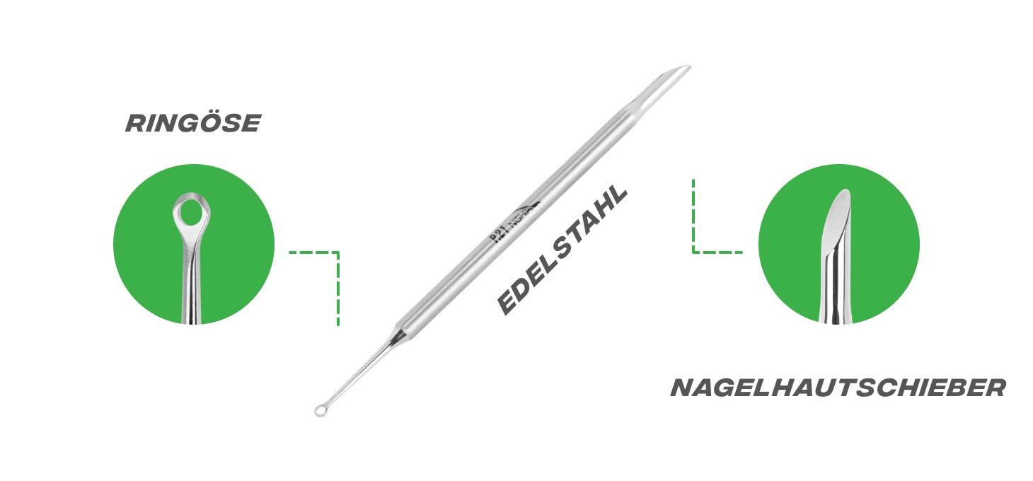 • Ringförmige Öse eignet sich ideal zum Entfernen der Nagelhaut von der Nagelplatte und den umliegenden Nagelfalzen.