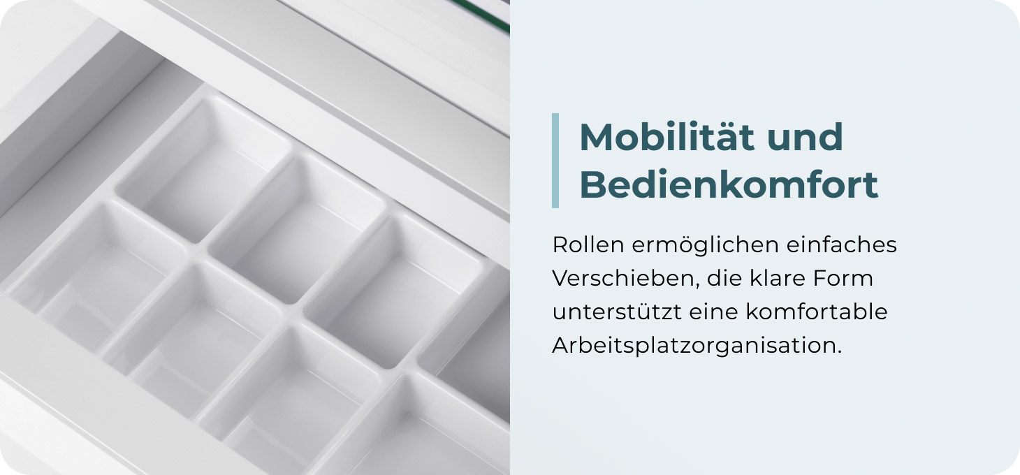 Der Wagen verfügt über ein rückseitiges Panel mit drei Steckdosen sowie zwei USB-Ports und einem USB-C-Anschluss, wodurch verschiedene Geräte bequem angeschlossen werden können. Kabeldurchführungen in den Seitenwänden bei der oberen Schublade helfen, Ordnung zu halten. Eine integrierte Halterung für eine Lupenlampe ermöglicht die stabile Befestigung des Lampenarms nahe dem Behandlungsbereich, ohne die Arbeitsfläche zu belegen, und unterstützt präzises Arbeiten sowie ergonomische Bedingungen.