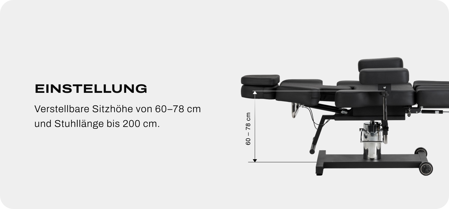 Die Sitzhöhe lässt sich mithilfe des hydraulischen Zylinders im Bereich von 60–78 cm verstellen, während der Stuhl im vollständig ausgeklappten Zustand eine Länge von bis zu 200 cm erreicht. Die manuelle Einstellung des Neigungswinkels von Rückenlehne und Beinauflagen ermöglicht eine Anpassung an die jeweilige Behandlung. Die geteilte Beinauflage mit unabhängiger Segmentverstellung und seitlicher Einstellung erlaubt eine individuelle Positionierung der Beine und erhöht sowohl den Arbeitskomfort als auch die Bewegungsfreiheit. Die ausziehbare Beinauflage bietet auch größeren Personen eine stabile Unterstützung. Abnehmbare Armlehnen mit Höhen- und Winkelverstellung erweitern die Einstellmöglichkeiten und erleichtern die Anpassung an aktuelle Bedürfnisse. Das Ergebnis ist eine ergonomische und funktionale Lösung, optimal auf die Anforderungen eines professionellen Tattoostudios abgestimmt.