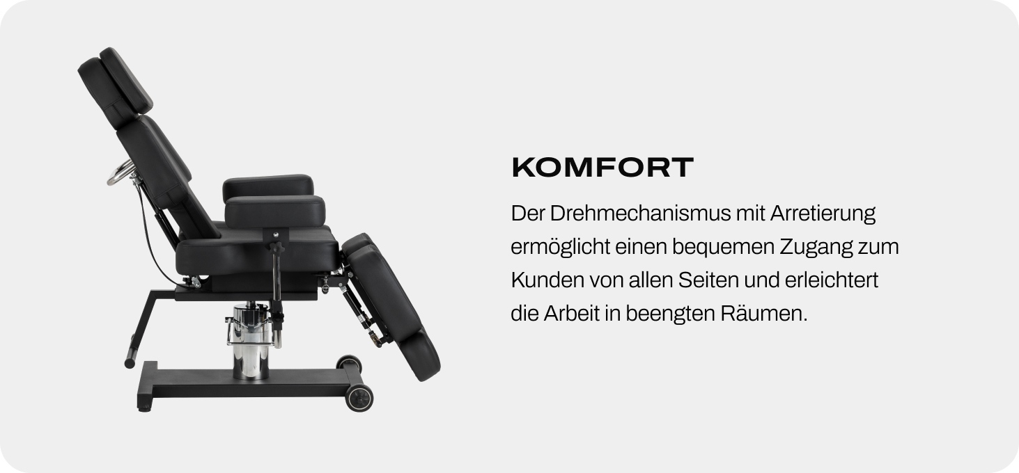 Der Vollrotationsmechanismus mit Arretierfunktion sorgt für außergewöhnliche Funktionalität und ermöglicht freien Zugang zum Kunden von allen Seiten – auch in begrenzten Räumen. Die Konstruktion erlaubt das Ausklappen in eine bequeme Liegeposition, während die im Kopfteil integrierte, unter einem Kissen verborgene Öffnung optimalen Halt und Komfort bei Behandlungen in verschiedenen Positionen bietet. Eine zusätzliche Fußstütze ermöglicht bequemes Sitzen im Reitsitz, und ihre Längenverstellung erlaubt die Anpassung an Nutzer unterschiedlicher Körpergröße.