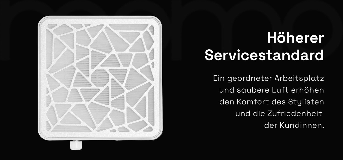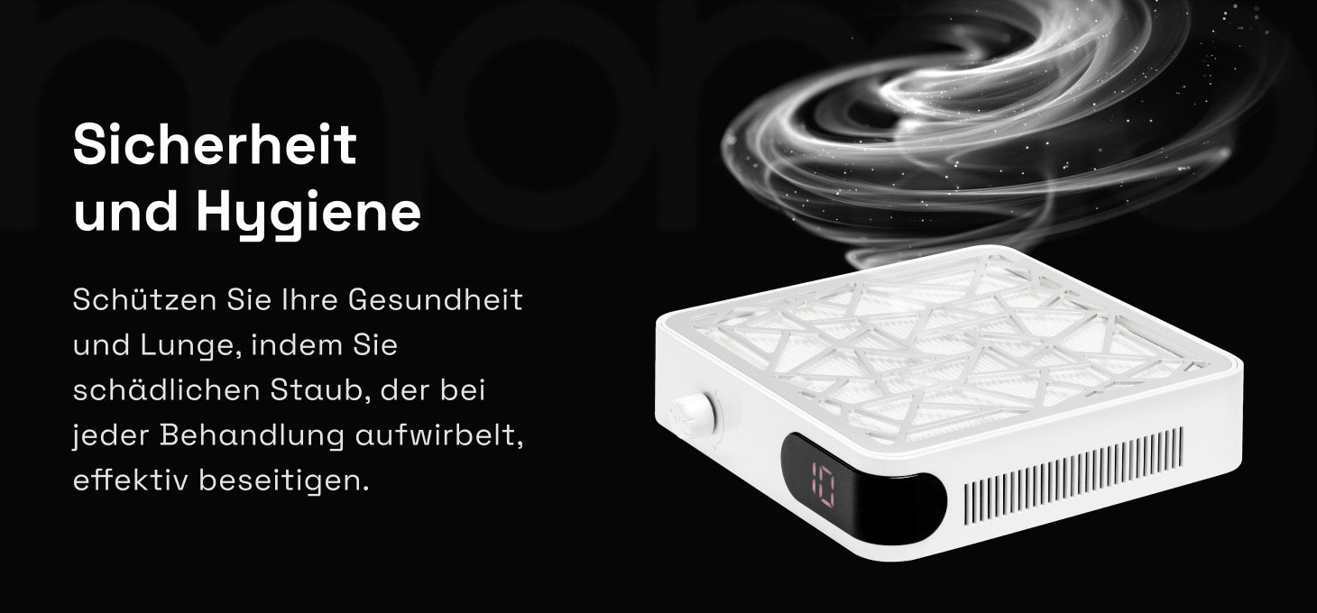 Der ständige Kontakt mit feinem Staub ist ein fester Bestandteil des Nagelstylings. Ein leistungsstarker Staubabsauger begrenzt dessen Anwesenheit in der Luft wirksam und trägt zu einem sauberen, ordentlichen Arbeitsplatz sowie zu komfortableren Behandlungsbedingungen bei. Diese Lösung unterstützt einen hohen Hygienestandard im Studio und steigert den Komfort sowohl für die Stylistin als auch für die Kundinnen.