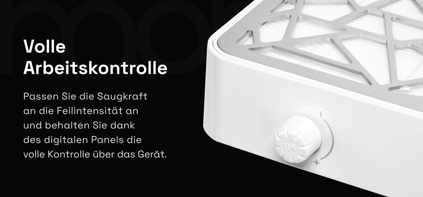 Die zehnstufige Leistungsregelung ermöglicht eine exakte Anpassung der Saugstärke an die Art der Behandlung und die Intensität des Feilens. Die Pausenfunktion erlaubt ein kurzfristiges Unterbrechen der Arbeit ohne Änderung der Einstellungen, während das gut lesbare Display über die aktuell gewählte Leistungsstufe informiert und volle Kontrolle während des Stylings gewährleistet.